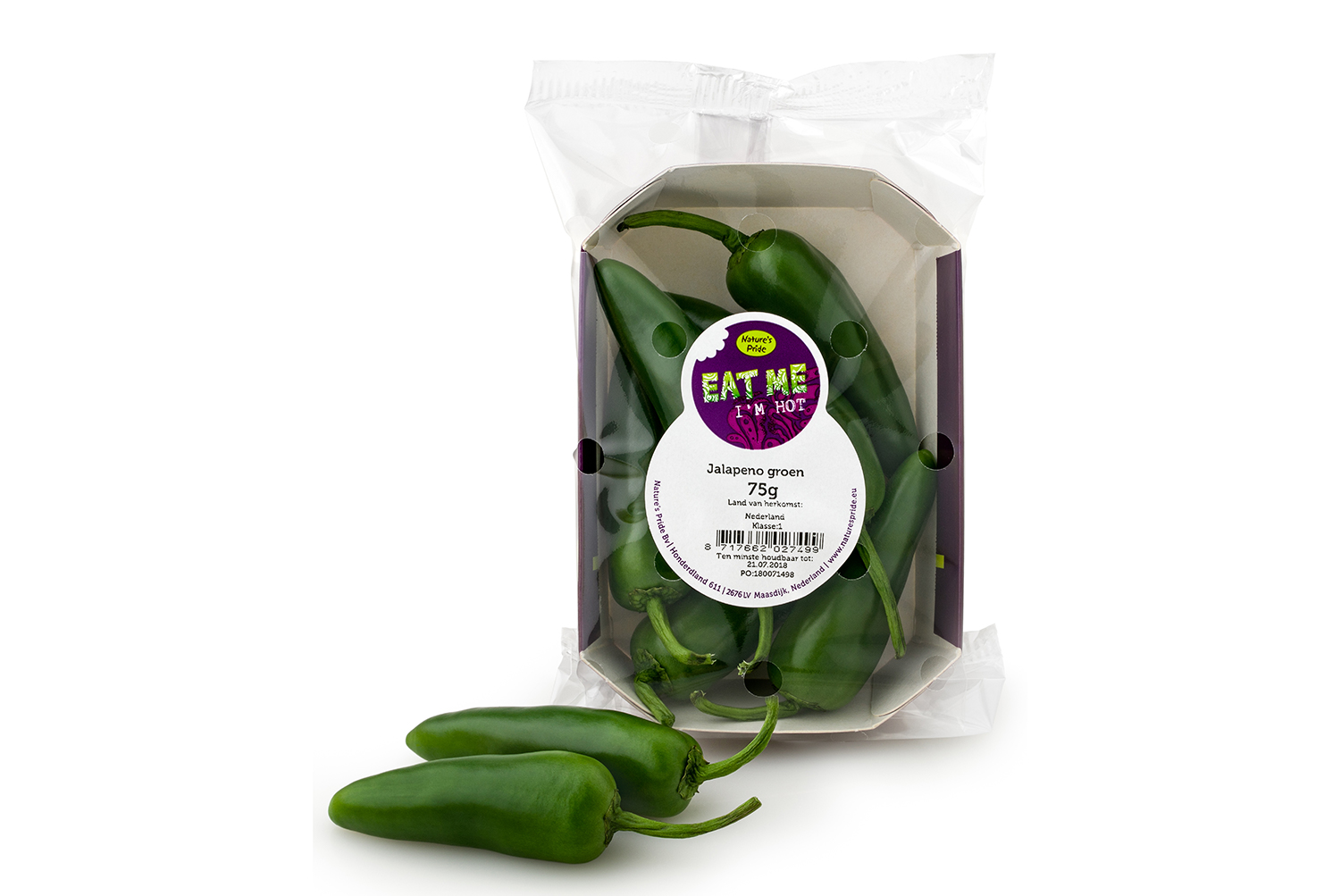 Jalapeño Chilis von EAT ME wachsen in den Niederlanden, Spanien und Marokko. Je nach Klima bauen die Erzeuger sie in Gewächshäusern oder im Freiland an. In beiden Fällen fängt die Chilipflanze als Samen an. Sie werden in Gärtnereien zu kleinen Pflanzen herangezogen. Bei einer Höhe von etwa 40 cm werden die Pflanzen in einen Topf oder einen Steinwollblock gesetzt, als Vorbereitung für ihr weiteres Wachstum auf dem Feld oder im Gewächshaus. Sechs bis acht Wochen später beginnt die Ernte. Es ist bemerkenswert, dass die Chilischoten grün geerntet werden. Sie färben sich von selbst in ihren gewohnten Rotton.