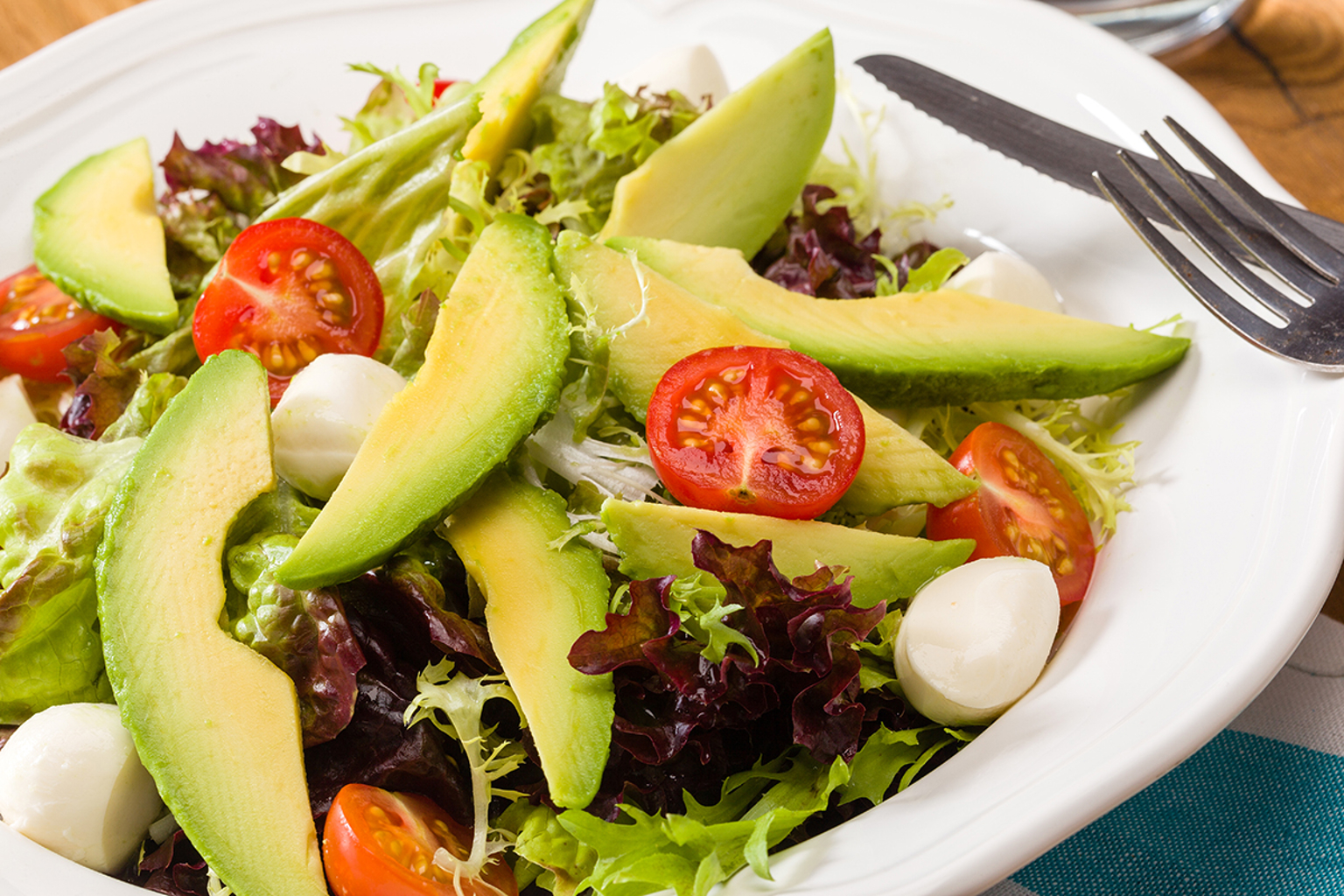 Die Avocado um den Kern herum durchschneiden. Beide Hälften voneinander abdrehen. Den Kern entfernen, das Fruchtfleisch aus der Schale löffeln und in dünne Scheiben schneiden. Über den Salat verteilen und mit dem Pesto beträufeln.