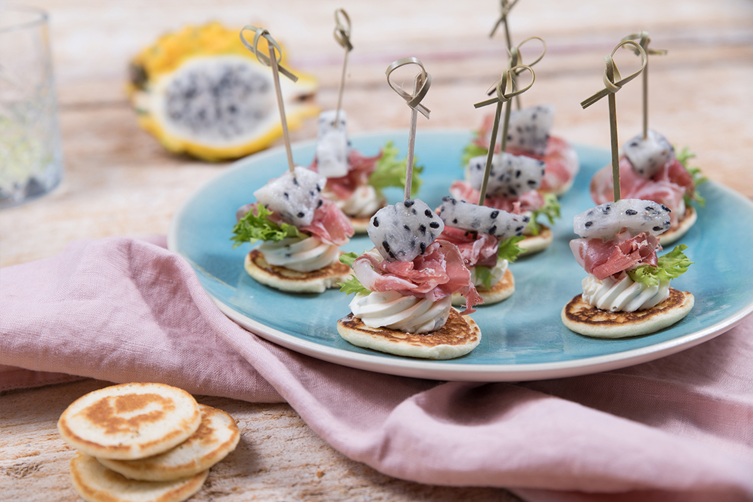 Aus gelber Drachenfrucht lassen sich leckere Snacks zubereiten. Kombiniere frisch gebackene Blinis mit Frischkäse und dem erfrischenden Geschmack von gelber Drachenfrucht.