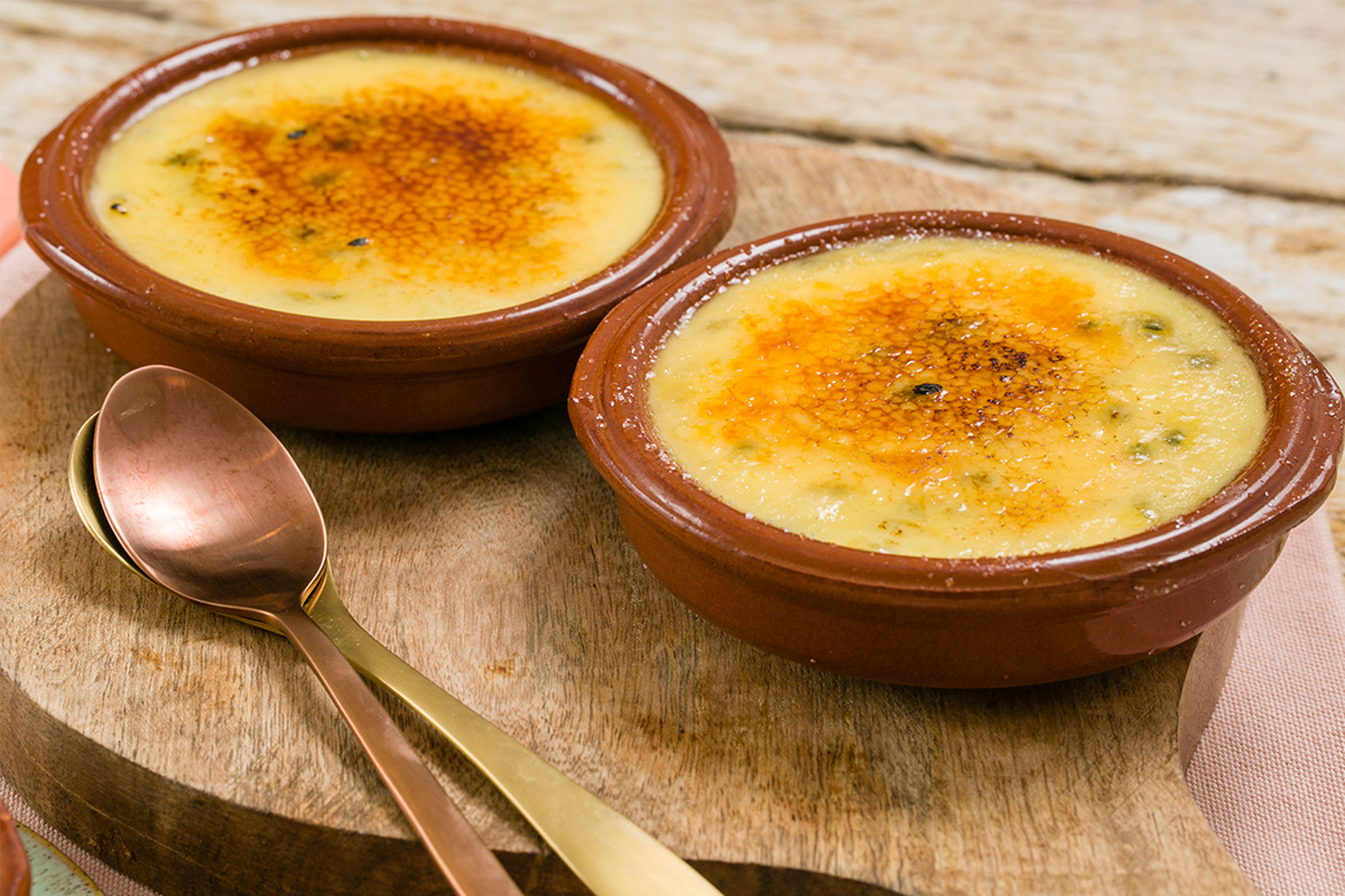 Der Passionsfrüchte halbieren, das Fruchtfleisch herauslöffeln und der Sahne hinzufügen. Die Vanilleschote herausnehmen. Die Ramequins in eine große Auflaufform legen und den Rahm gleichmäßig über die Ramequins verteilen. Die Auflaufform mit Wasser füllen, bis 2/3 der Ramequins unter Wasser stehen.