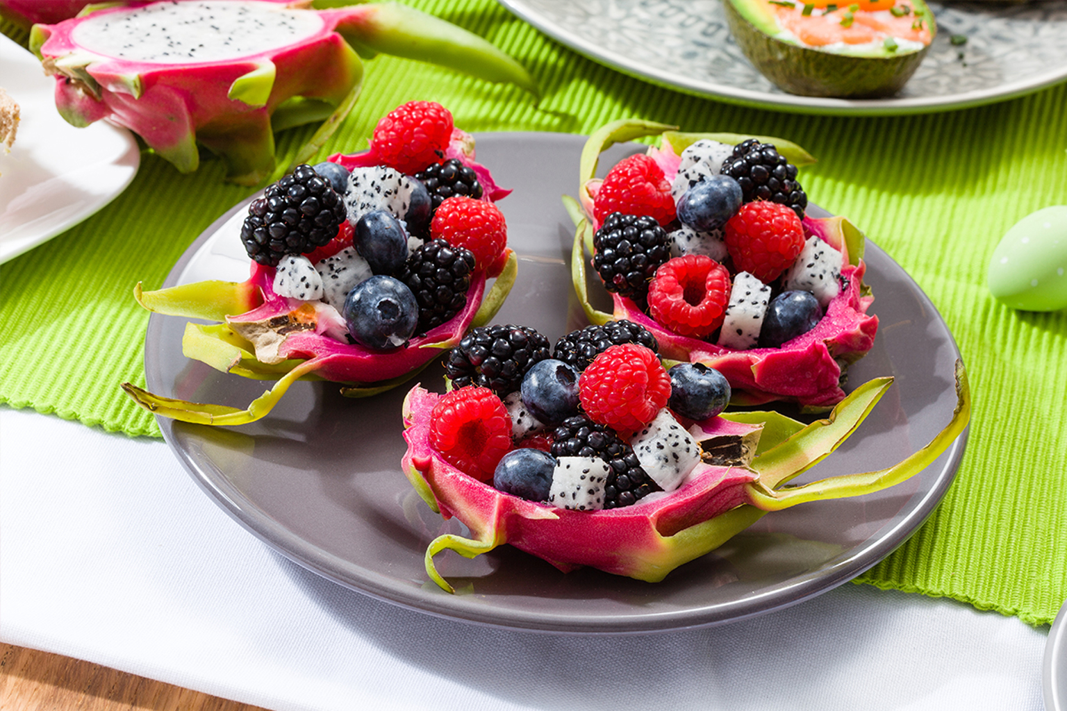 - Die Heidelbeeren, Himbeeren, Brombeeren und Drachenfruchtwürfel in der Drachenfruchtschale verteilen.