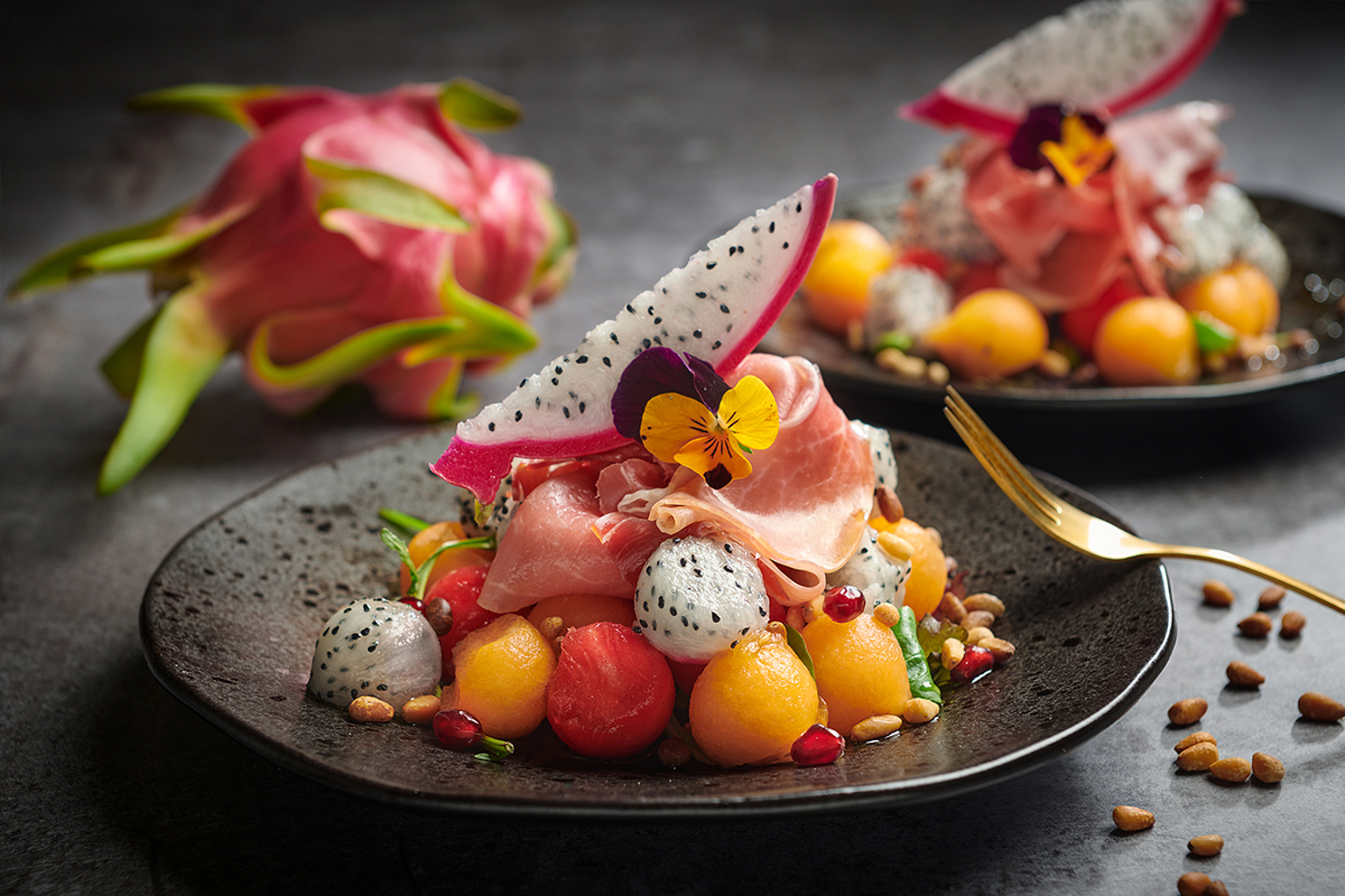 Eine besonders edle Melone mit Schinken. Zwei Sorten Melone und eine Drachenfrucht obendrauf. Sorge dafür, dass die Melone gut gekühlt ist. Passt perfekt zum Grillen.