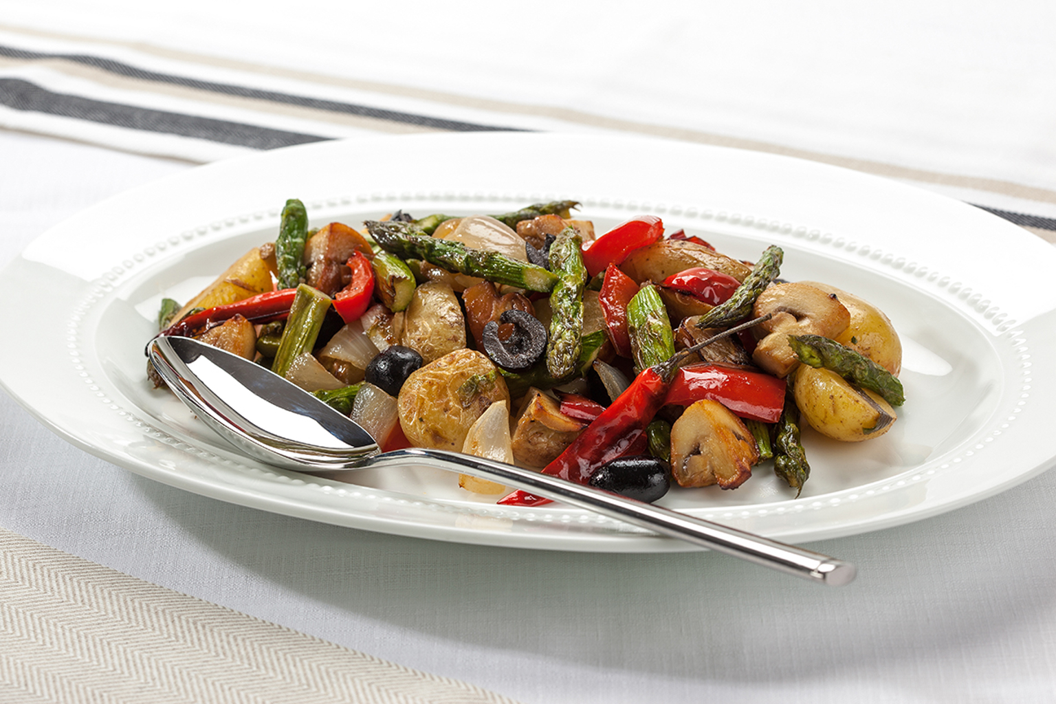 Die Paprika halbieren, die Samen entfernen und in grobe Stücke schneiden. Den Knoblauch grob hacken. Das Gemüse mit Knoblauch und Oliven auf einem mit Backpapier ausgelegten Backblech vermischen, mit Olivenöl beträufeln und mit Pfeffer und Salz nach Belieben würzen.