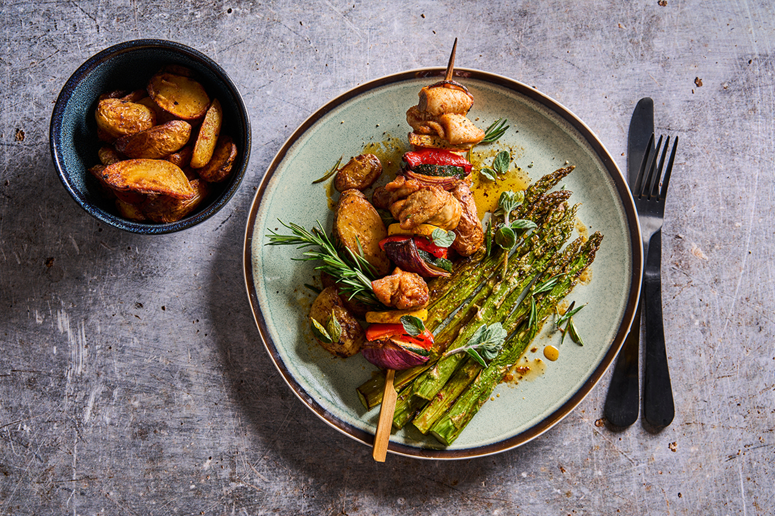 Grüner Spargel mit Jungkartoffeln und Hähnchen-Schaschlik