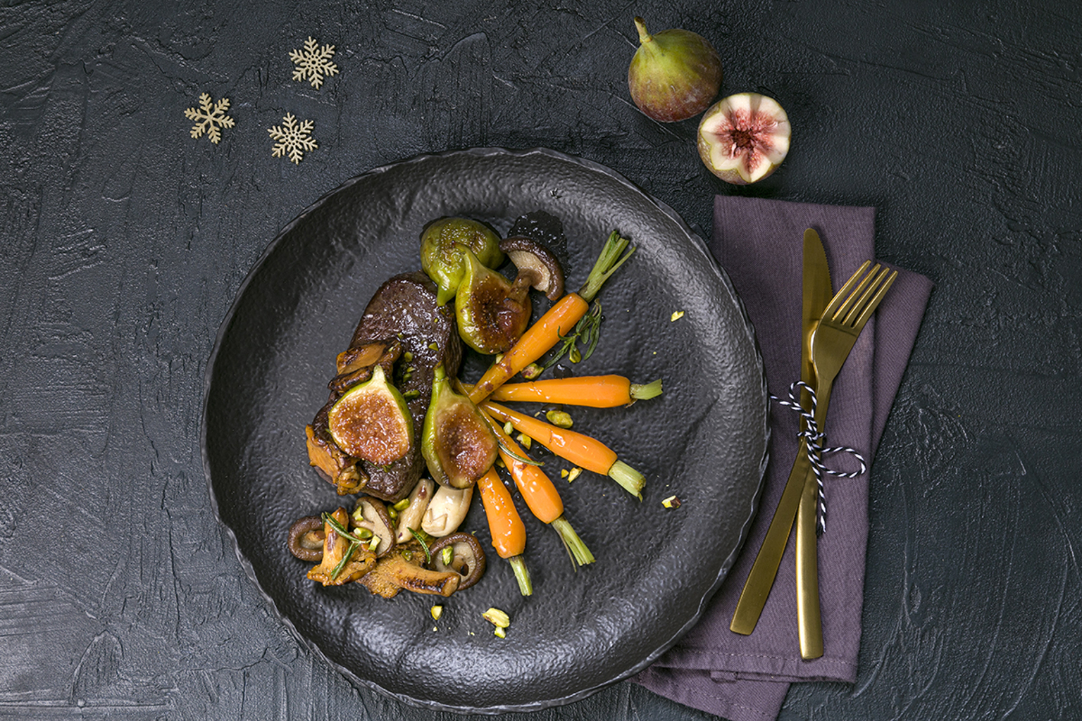 Die Pistazien grob hacken. Die Mini-Karotten, die Steaks, die Feigen und die Pilze auf vier (warme) Teller verteilen. Die Sauce darüber verteilen und mit Pistazien abrunden.