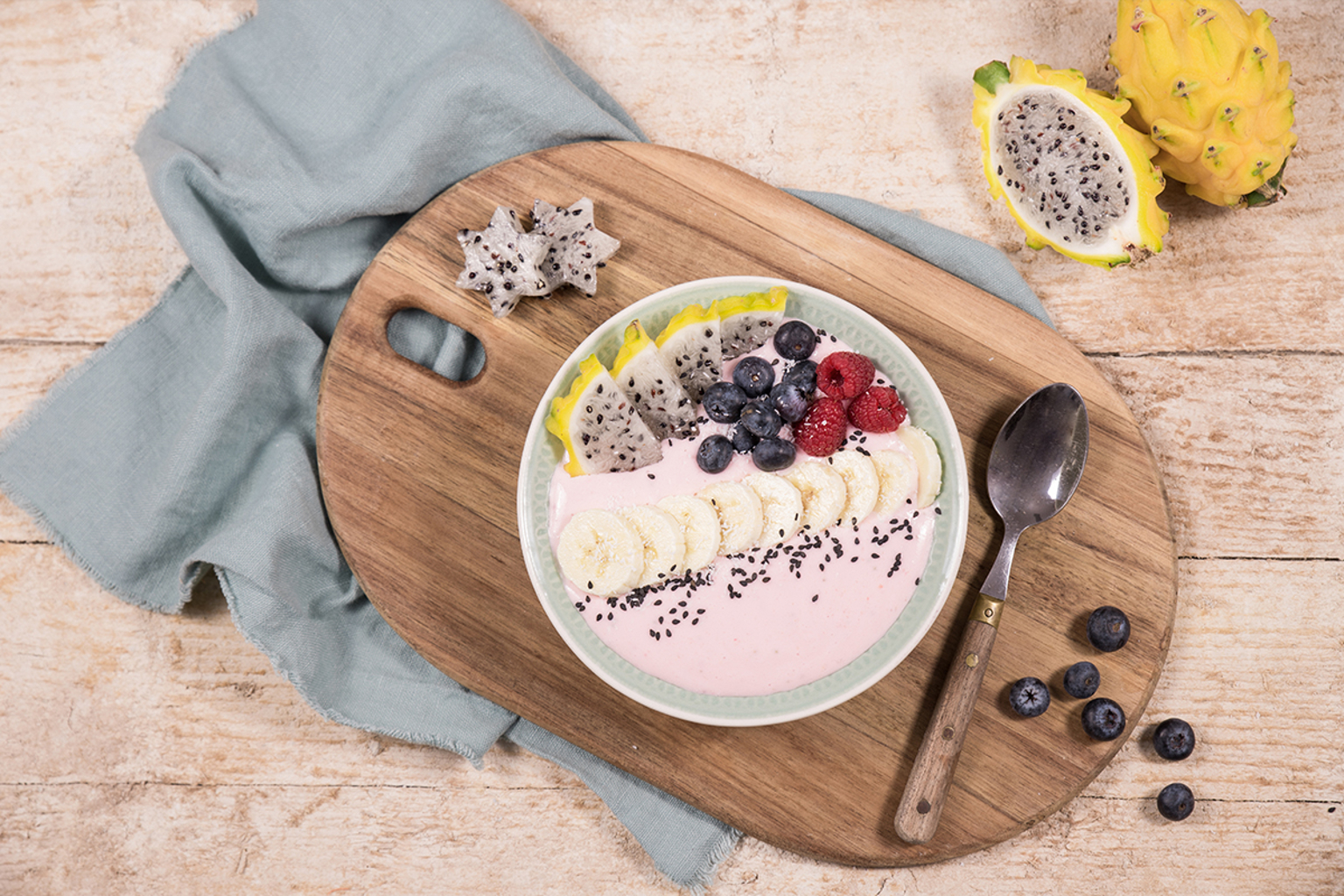 Die Joghurt-Bowl ist immer noch trendy und auch sehr lecker. Sie ist schön frisch und schmeckt nach Erdbeeren, Heidelbeeren, Himbeeren und gelber Drachenfrucht. Die gelbe Drachenfrucht sorgt für eine zusätzliche exotische Note.