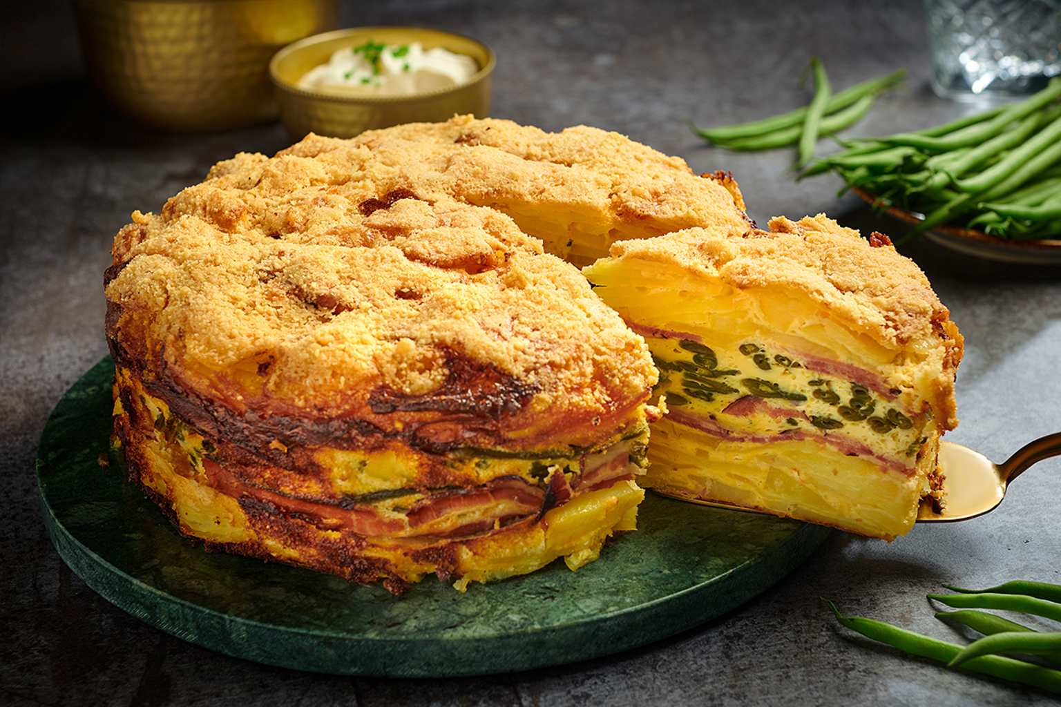 Die Hälfte der Kartoffeln in der Sprungform verteilen. Die Hälfte des Katenspecks darauflegen und dann die Prinzessbohnen. Den restlichen Speck und die Kartoffeln darüber verteilen. Die Eimischung darüber gießen und mit dem Käse bestreuen.