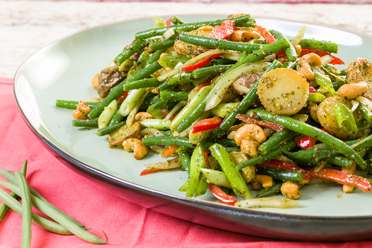 Die jungen Kartoffeln mit den Prinzessbohnen, der Zwiebel, Paprika, Frühlingszwiebeln und dem Pesto vermengen. Mit Cashewnüssen bestreuen.