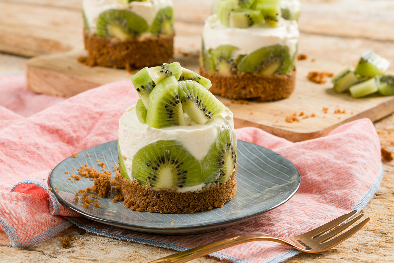 Zwei Kiwis schälen, der Länge nach halbieren und in Scheiben schneiden. Die Scheiben gegen die Seite der Tortenringe stellen. Die Frischkäsefüllung darauf verteilen. Mindestens zwei Stunden im Kühlschrank fest werden lassen.