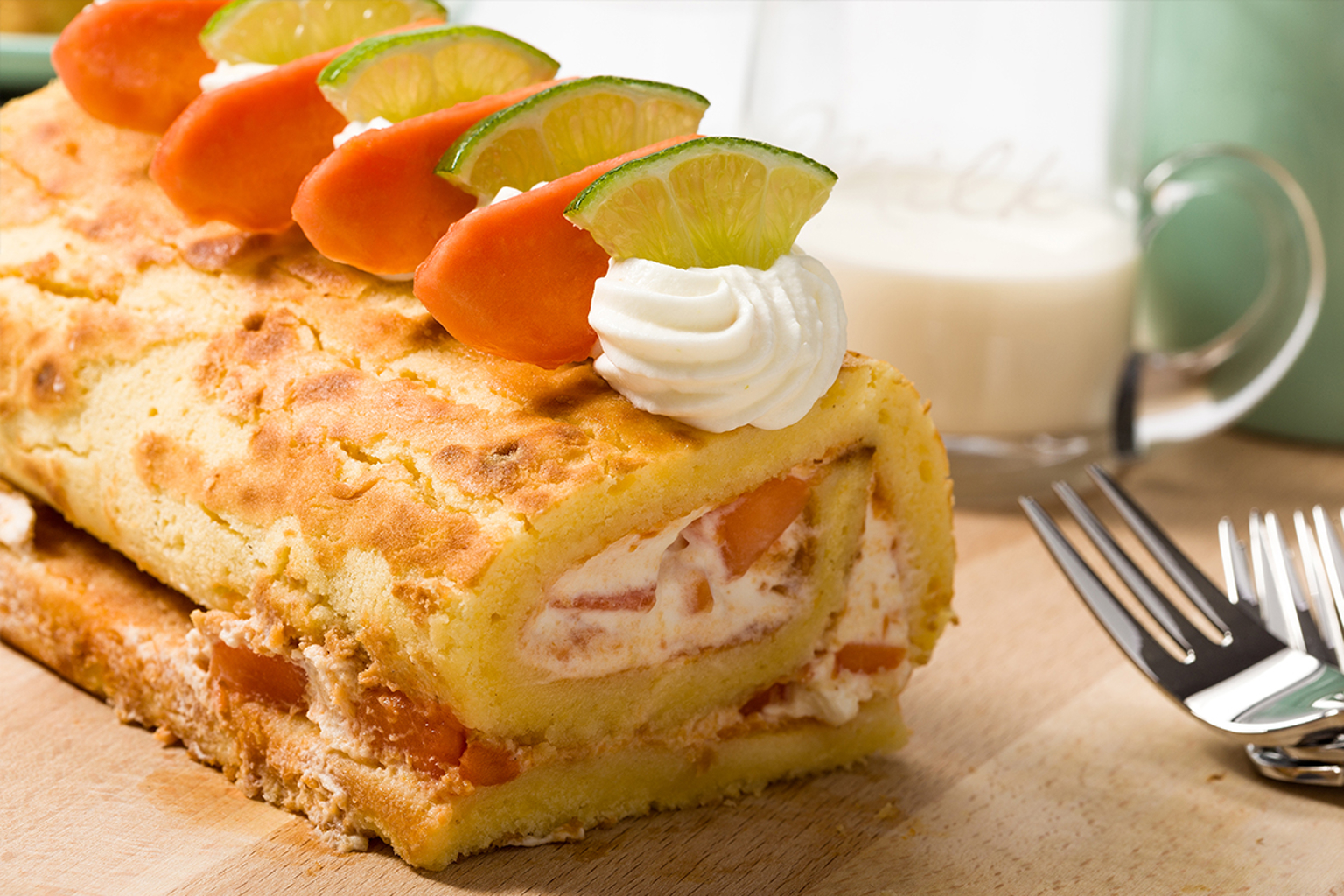 Den Kuchen vorsichtig von der Längsseite her aufrollen. Die Rolle mit Limettencreme, Papayawürfeln und eventuell zusätzlichen Limettenscheiben dekorieren.