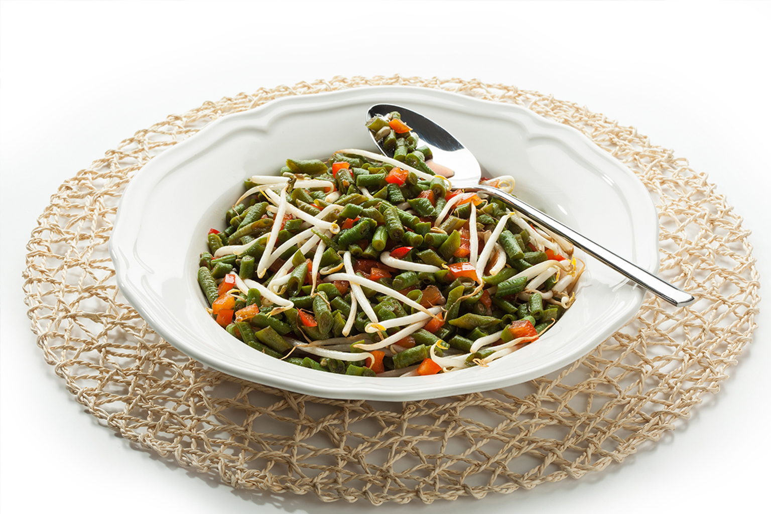 Die Schlangenbohnen mit der Paprika und den Sojasprossen mischen und mit dem Dressing verfeinern.