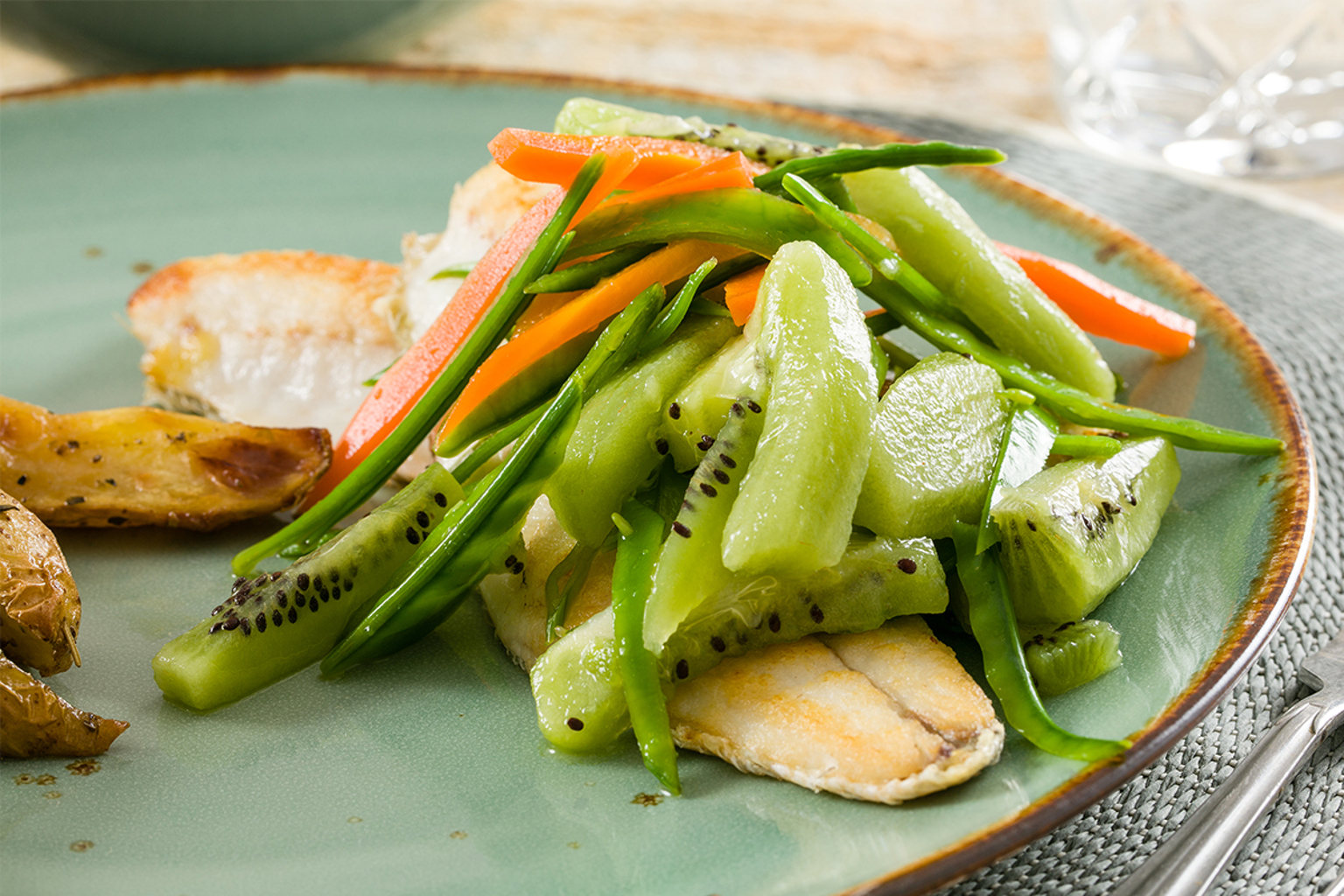 Die Möhren schälen und in dünne Streifen schneiden. Die Zuckererbsen in ähnlich große Streifen schneiden. Möhren und Zuckererbsen drei Minuten bissfest kochen. Unter kaltem und fließendem Wasser abbrausen, um den Garprozess zu unterbrechen. Die Kiwis schälen und ebenfalls in Streifen schneiden. Die Kiwi mit den Möhren und den Zuckererbsen vermischen.