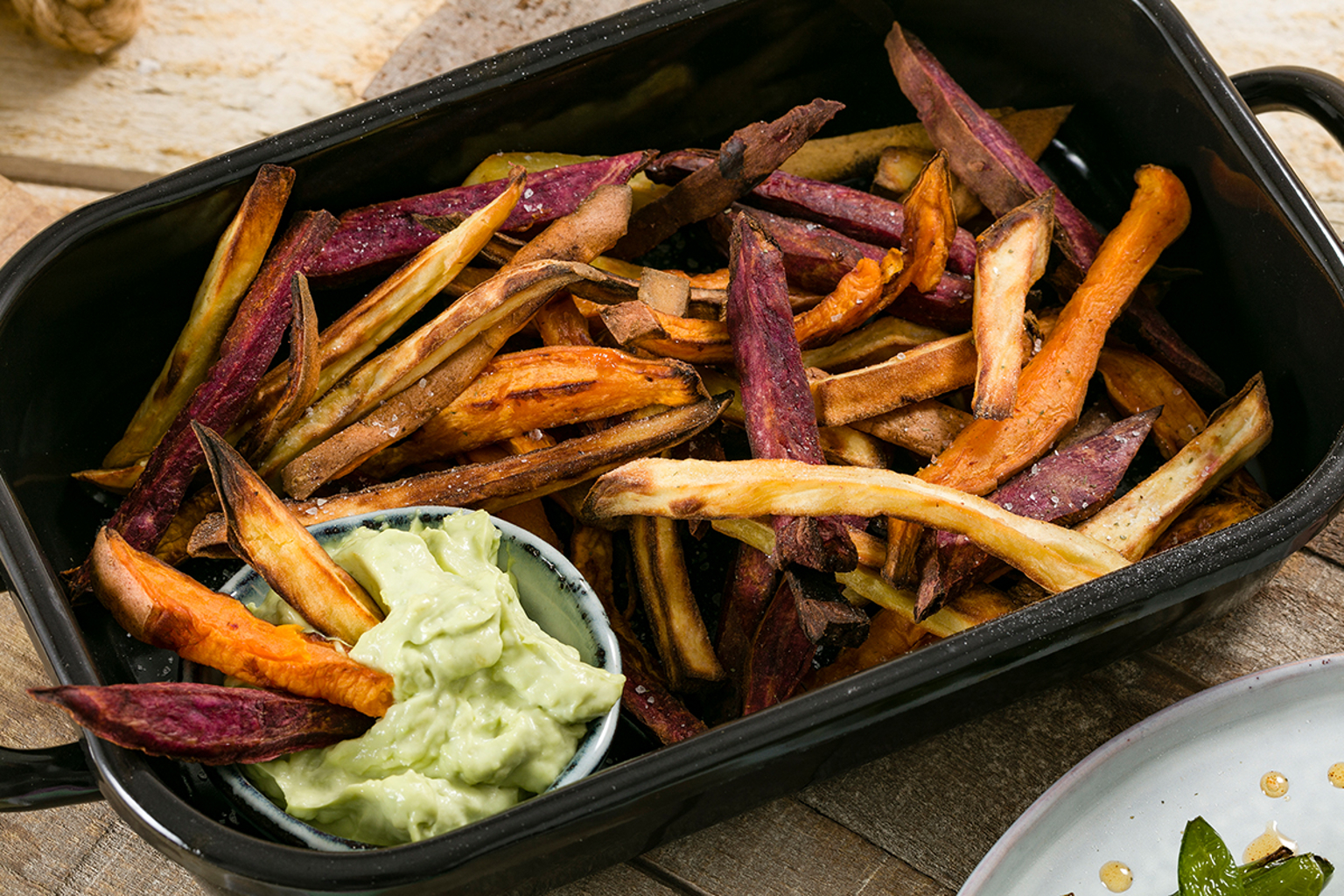 Diese Pommes sind zum Finger lecken. Durch die unterschiedlichen Farbtöne der Süßkartoffel sehen sie großartig aus. Pommes in den Avocadodip tauchen und genießen!