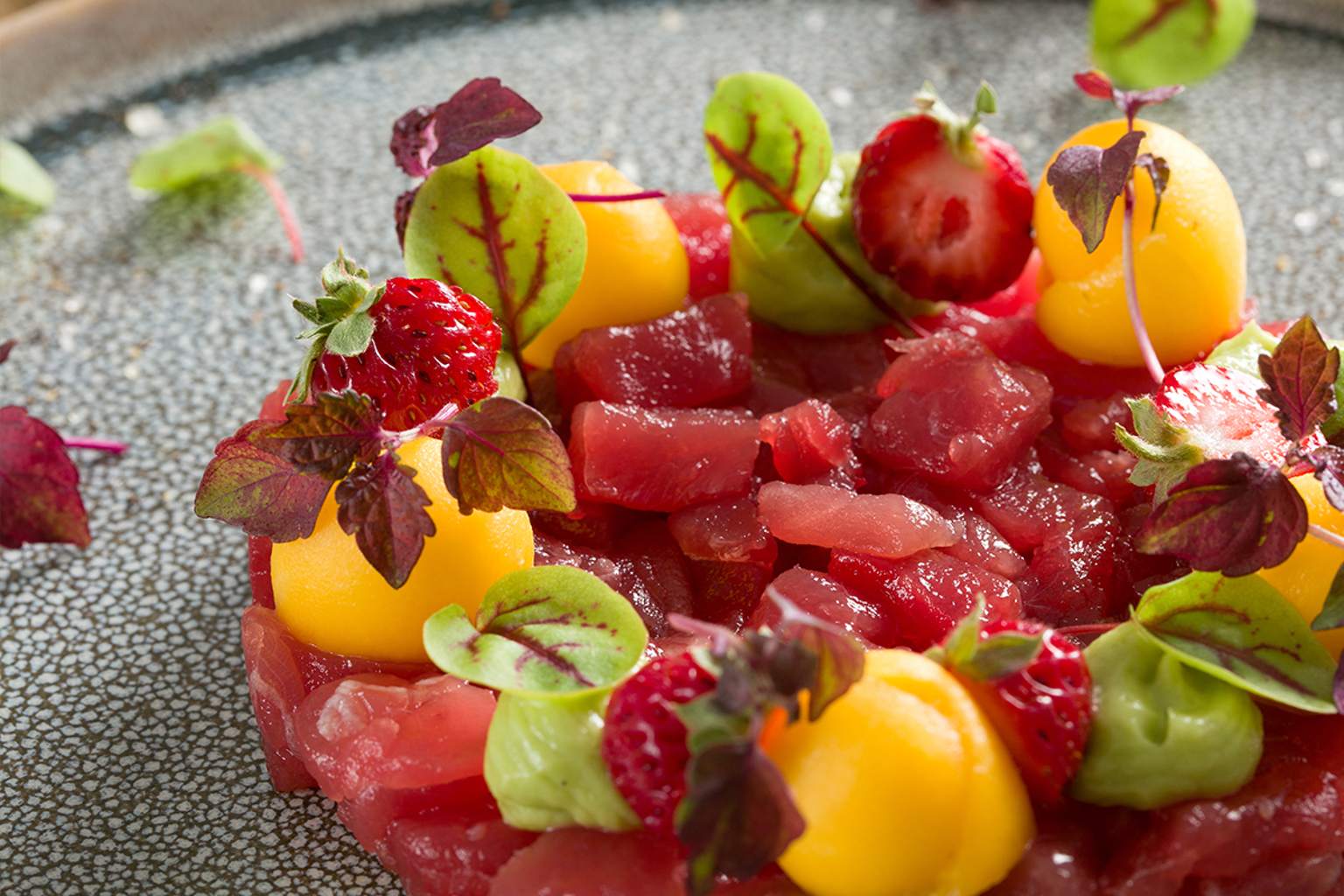 Den Portionierring mit Wasser abspülen, nicht abtrocknen, und auf einen Teller stellen. Den Ring mit einer dünnen Thunfischschicht füllen. Ein paar Mangokugeln darauf verteilen und ein paar Häubchen aus Avocadopüree darauf spritzen. Den Ring vorsichtig abnehmen und anschließend 3 weitere Tatartörtchen formen.