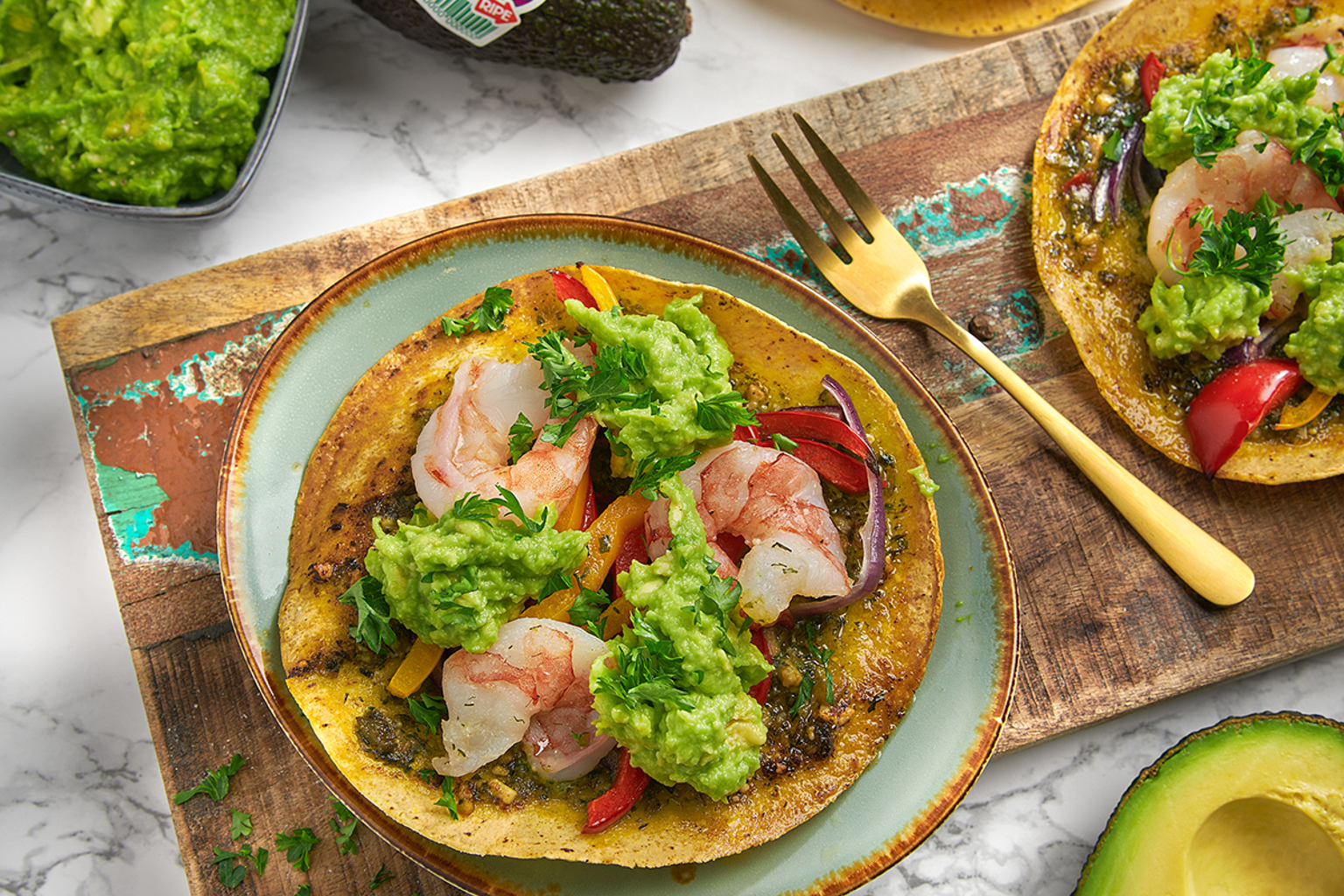 Auf Tostadas schmeckt fast alles gut. Natürlich auch Avocado. Eine knusperige Tostada kombiniert mit der weichen Struktur von Avocado. Mit dem süßlichen Geschmack von Gambas und dem Pep von Pesto. Perfekt!