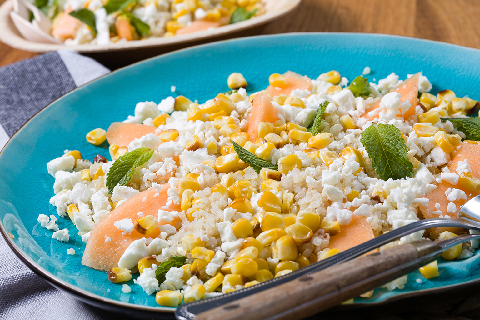 Die Maiskörner vom Kolben schneiden und mit Quinoa, Melone und Avocado mischen. Den Fetakäse darüber zerbröseln. Den Minze in dünne Streifen schneiden und zum Salat geben. Mit Olivenöl und Essig beträufeln und mit Salz und Pfeffer nach Geschmack würzen.