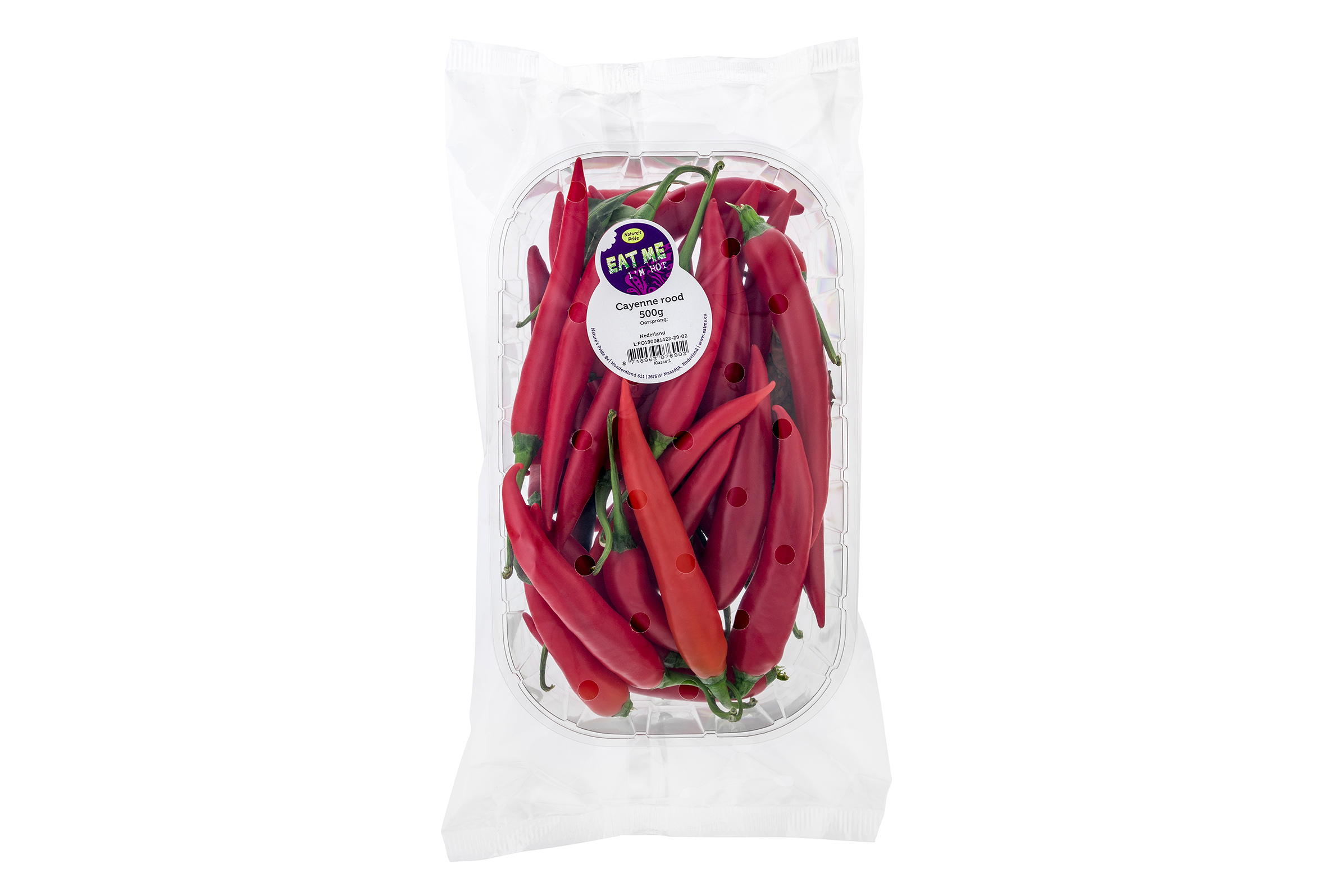 Chilli or cayenne pepper: this chilli answers to both names. With its striking curved shape and vibrant red colour, you can't miss the cayenne pepper in the vegetable category. It is one of the most widely used chillies in the kitchen and it owes its popularity to its somewhat milder flavour. At EAT ME we use our own ‘hot scale’ to express how hot chillies are. The cayenne pepper scores a 7 on the scale, so not too spicy.