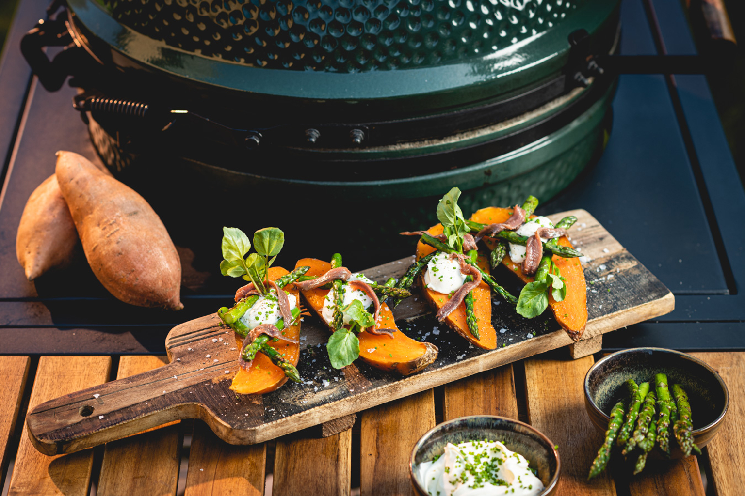 Light the BBQ and heat it to a temperature of 180 °C. Scrub the sweet potatoes, then dry them and place on a piece of aluminium foil.