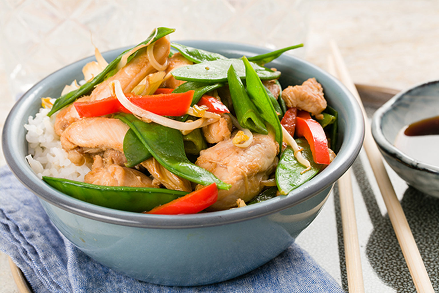 Add the peppers and mangetout and stir-fry for approx. 3 minutes. Add the spring onion, bean sprouts and teriyaki sauce and stir-fry for another 1 minute. Serve with the rice.