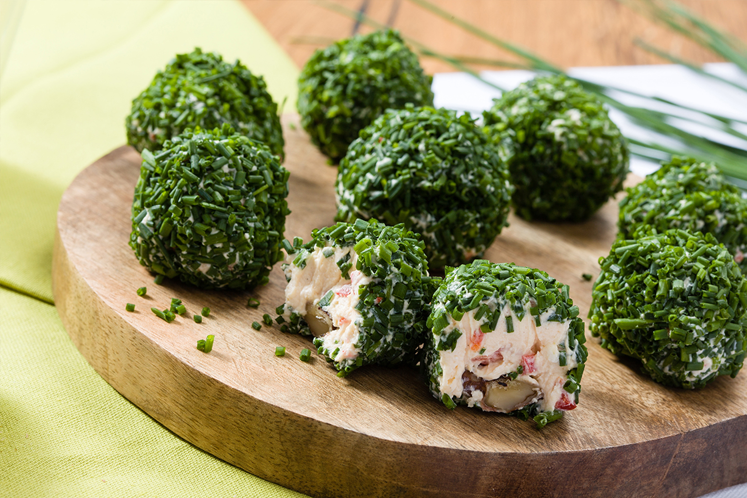 - Chop the chives as finely as possible and place in a shallow bowl. Use a teaspoon or a melon baller to make 14 equal sized balls of the cream cheese mixture. Press half a walnut into the centre of each ball. Roll each ball through the chopped chives to coat. Repeat the steps above to make another 13 balls.