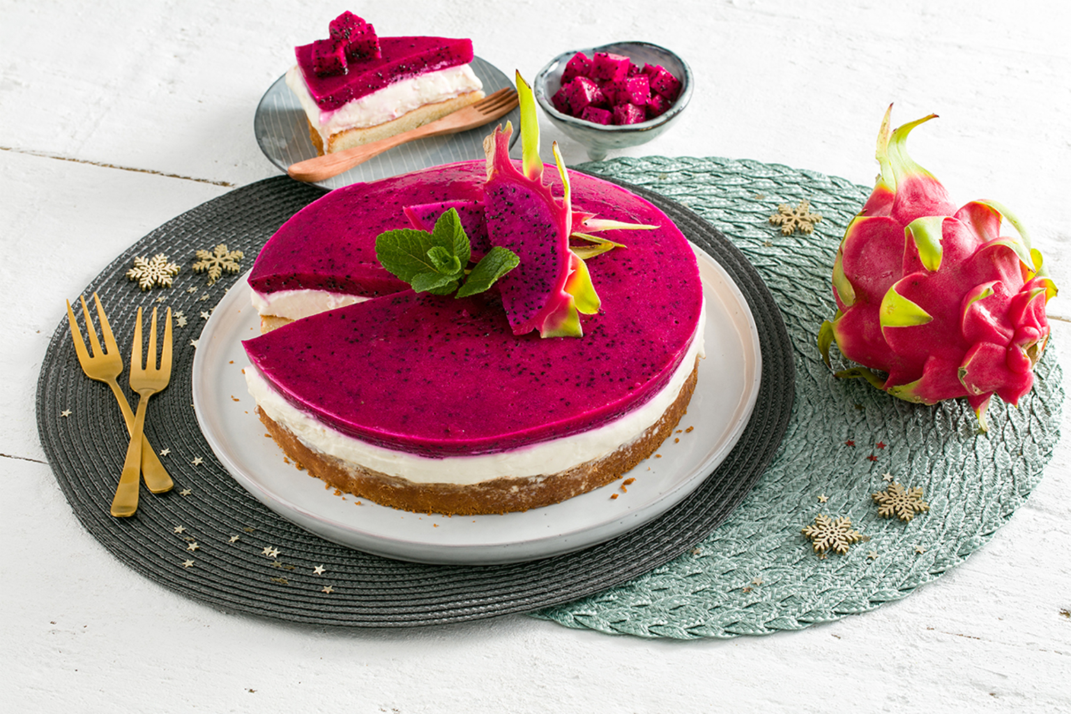 This festive cheese cake is an absolutely eye-catching dessert, but also perfect with a cup of tea or coffee. The red dragon fruit gives the cheesecake a mildly sweet flavour.