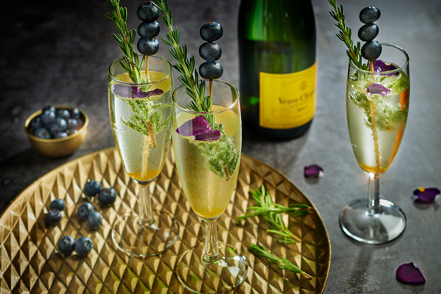- Thread three blueberries onto the end of each skewer. Put a sprig of rosemary in each glass.
