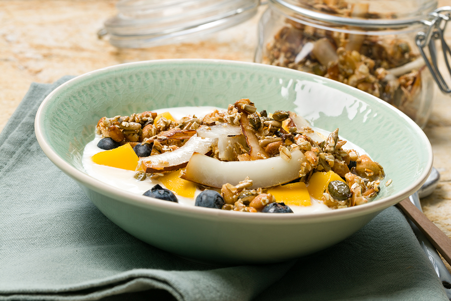 Pour the yogurt into 2 bowls. Divide the blue berries and mango over the bowls. Sprinkle with a quarter of the granola. Store the rest of the granola in a closed pot.