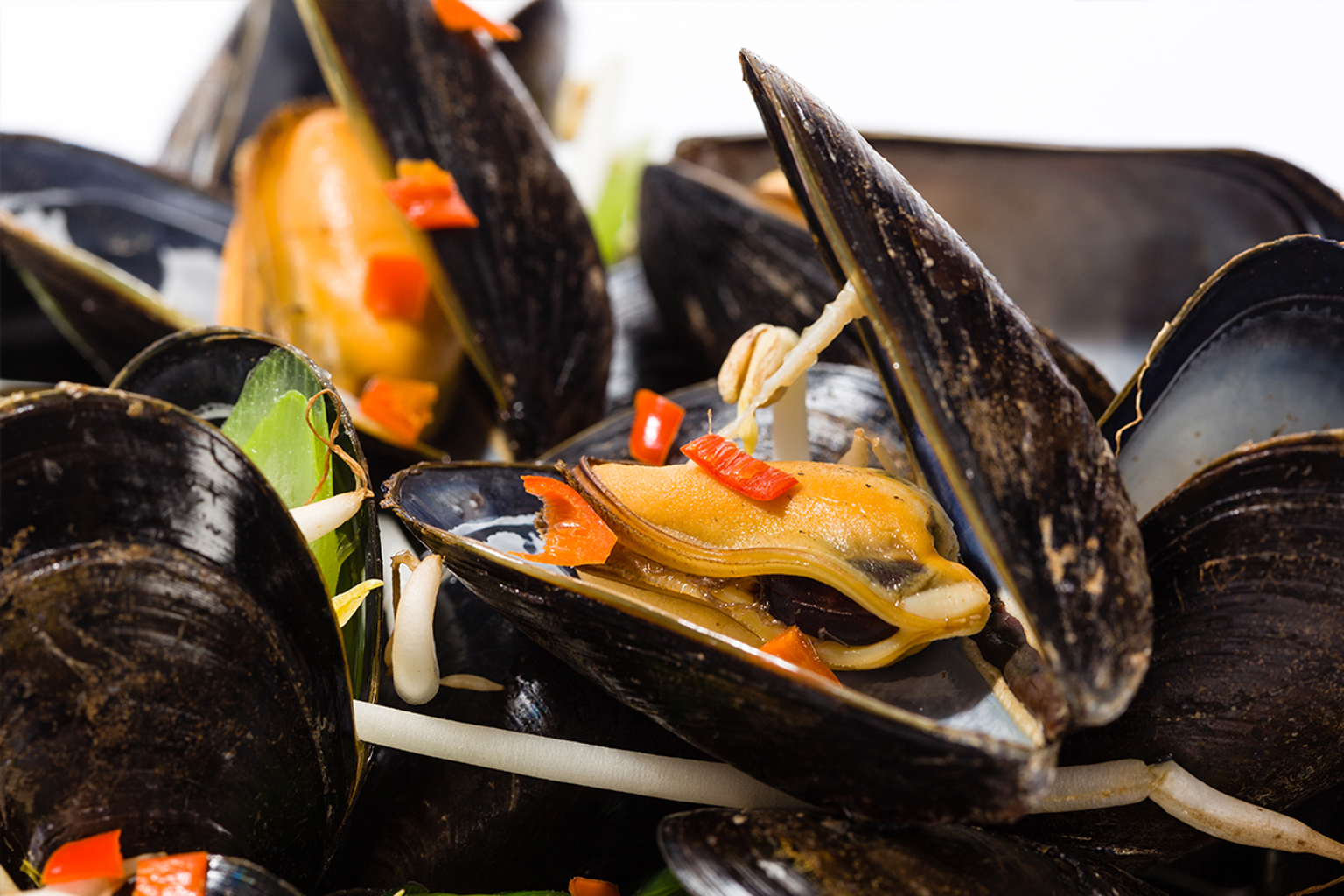Add the bean sprouts and spring onions and stir well. Add the mussels and cook them covered on a medium heat in approx. 6 minutes. Shake the pan regularly. They are cooked when the shells have opened. Discard any shells that are still closed. Serve immediately.
