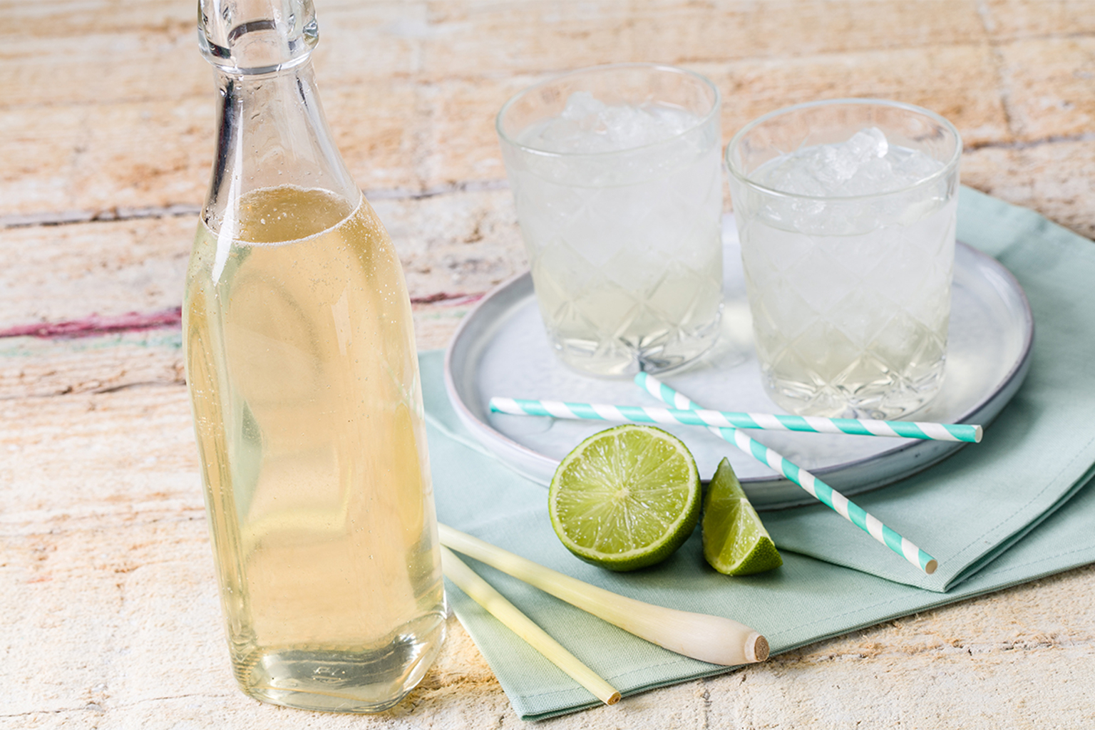 Squeeze the lime and add the juice. Remove the lemongrass stalks. Pour the syrup into a glass bottle with a cap. Pour some syrup into a glass and top up with (sparkling) water.