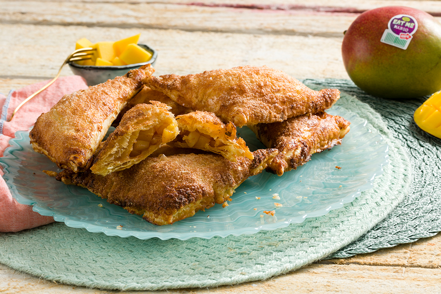 Spoon some of the mango apple mixture onto 1 half of the puff pastry near the tip. Leave 1 cm of pastry free around the edge. Moisten the edge with a little water and fold the rest of the puff pastry over to make a triangle. Press the edges firmly together with a fork or your fingers to seal.