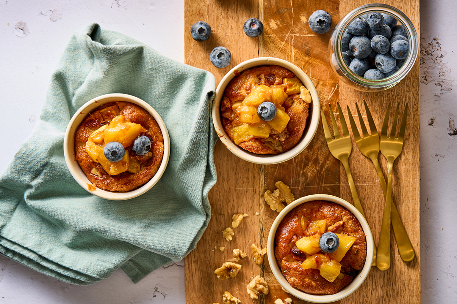 Beat the eggs with the quark. Add the flour, baking powder, 1 tsp of cinnamon and pinch of salt. Mix everything well and divide over the forms. Divide the baked mango over the cake forms (reserve some as a garnish)