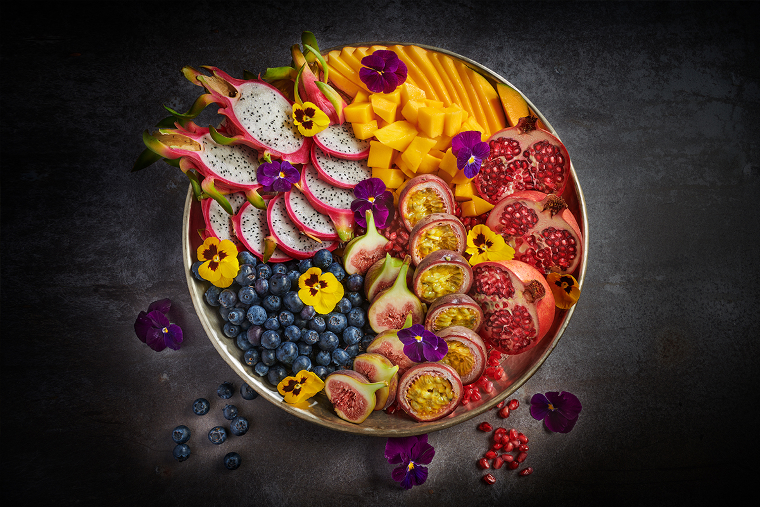 - Halve the passion fruit and halve the figs lengthwise. Halve the pomegranate, loosen the seeds and serve in the husk. Arrange the fruit attractively on a large platter.