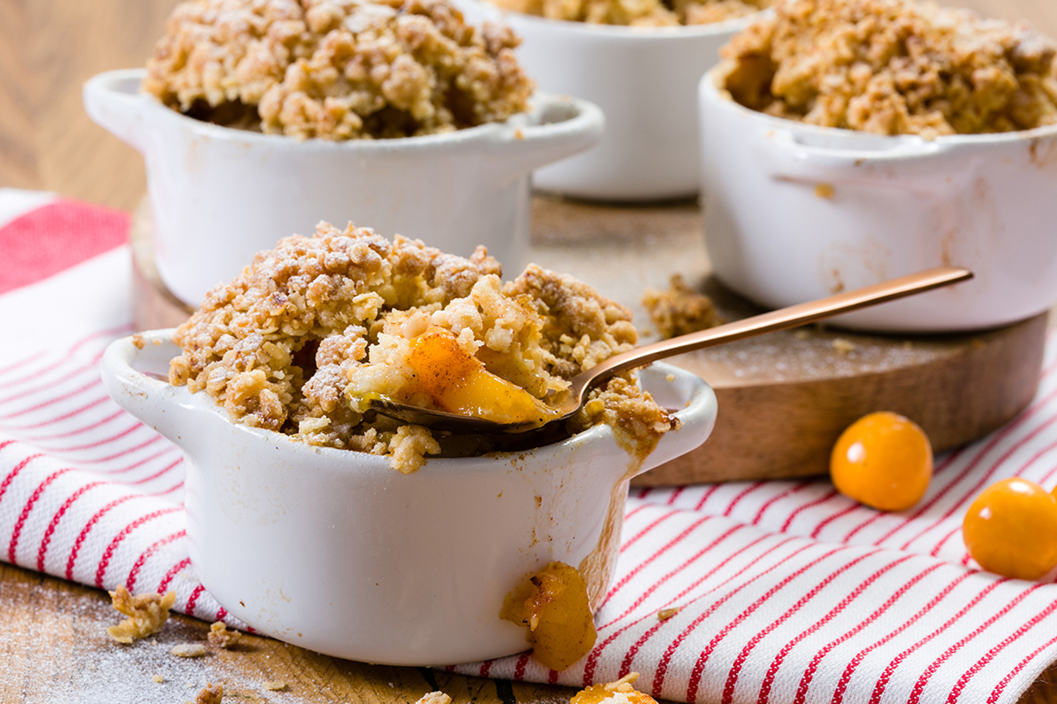 This physalis crumble is a heart-warming dessert. The oatmeal gives the crumble a nice crunch. Add an extra delicious touch with a scoop of vanilla ice cream.