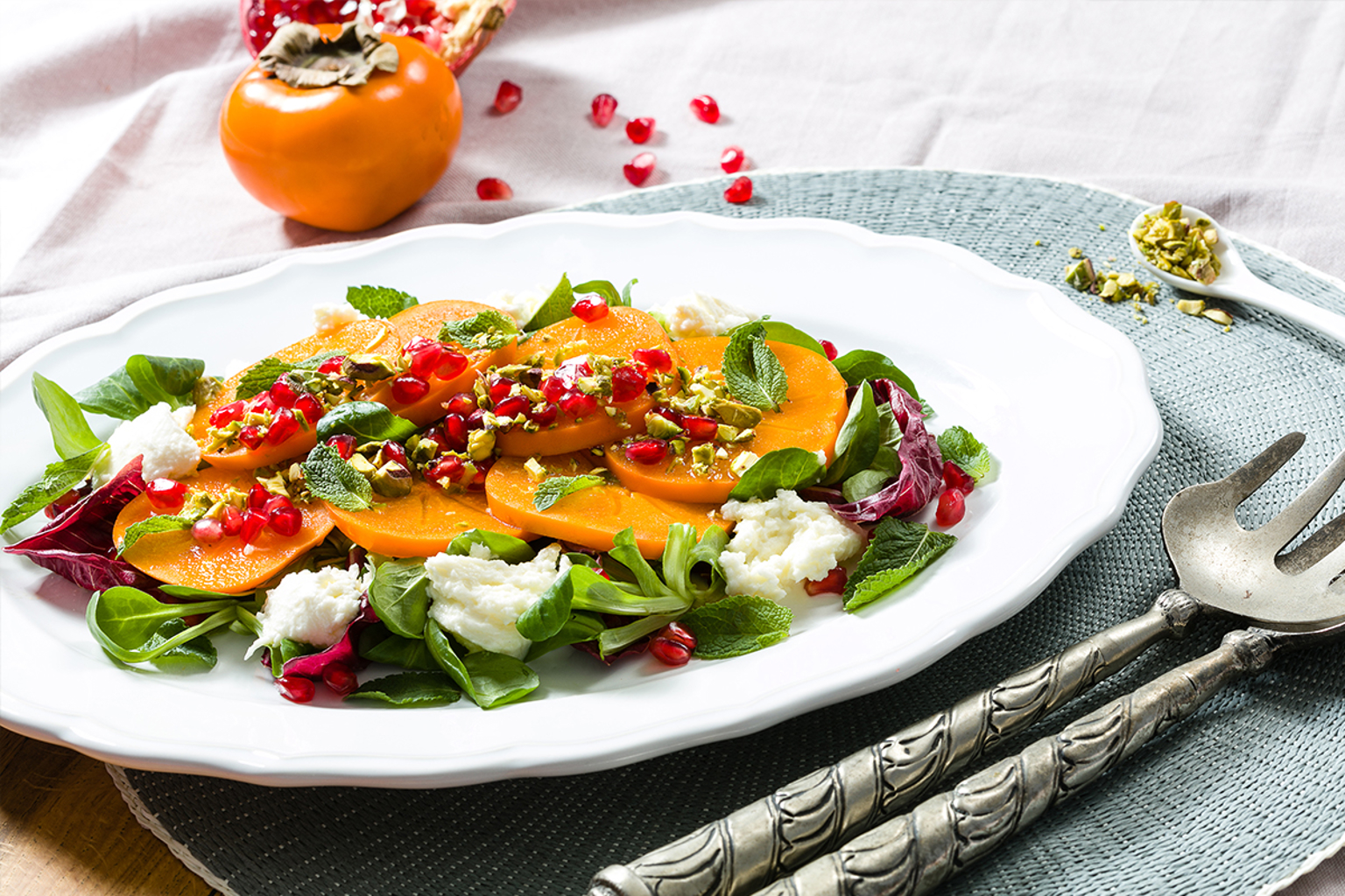 Prepare an attractive salad with a surprising flavour for a dinner party or barbecue. Sharon fruit has a wonderful, deep orange colour and makes a stunning eye-catcher if you slice it. Serve this salad on special plates for an extra wow factor.