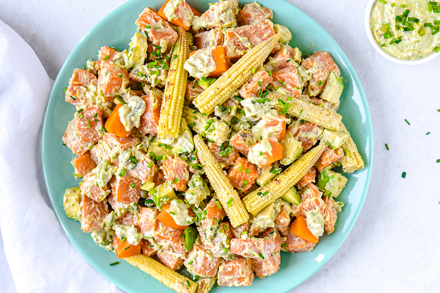 Mix the sweet potato, mini corn, cubed avocado, cornichons, ¾ of the chives and the capers in a bowl. Carefully spoon in the avocado mayonnaise and sprinkle with the rest of the chives.