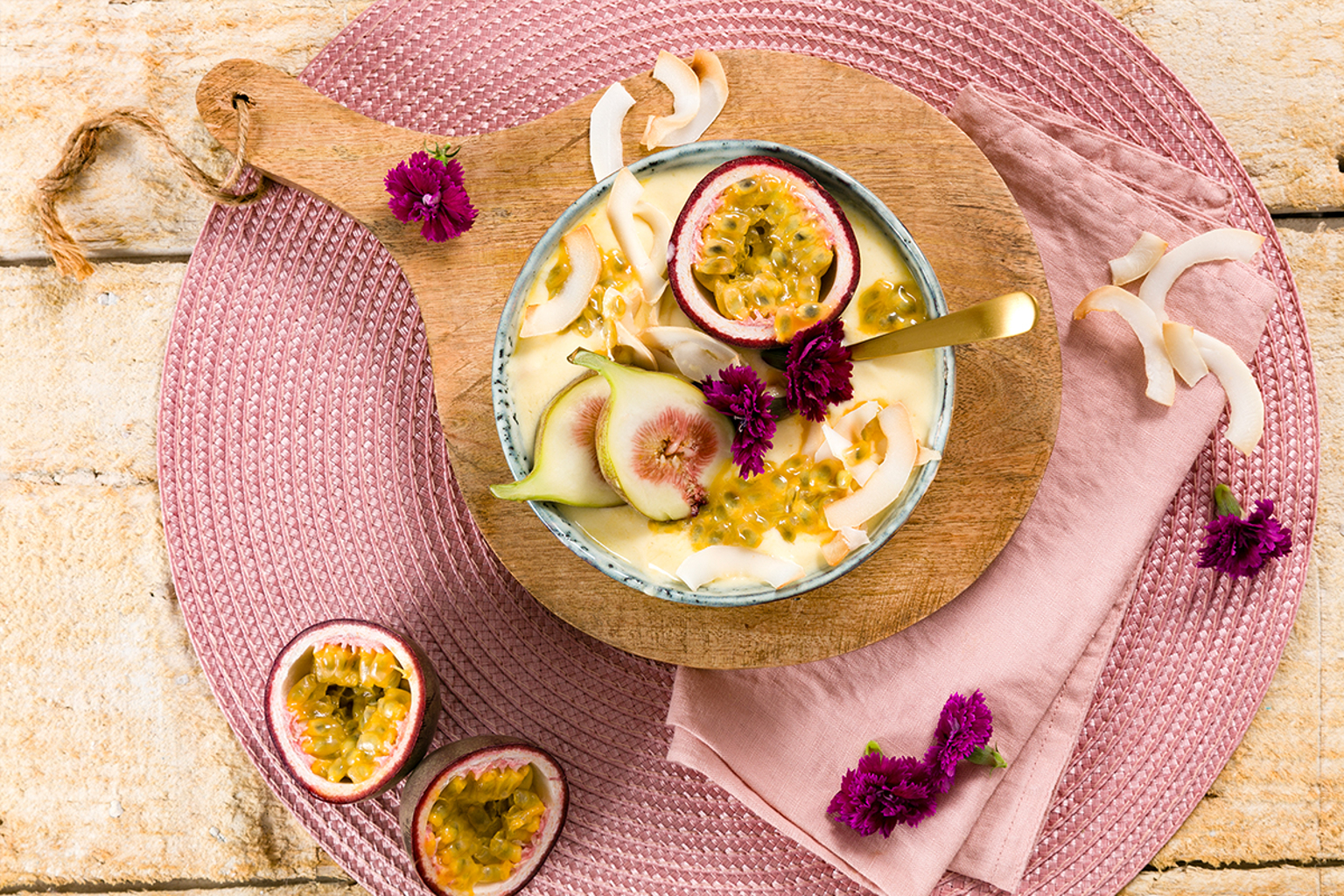 Halve the passion fruits, cut the figs into slices and divide over the smoothies. Sprinkle with the flaked coconut.