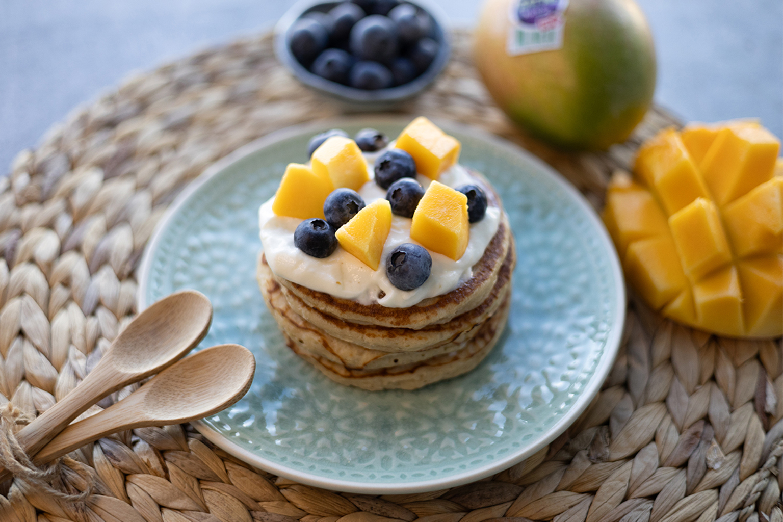 Met deze American pancakes wil je elke dag wel ontbijten. Door blauwe bessen en mango als topping aan dit ontbijtje toe te voegen heb je gelijk je portie vitamine binnen.