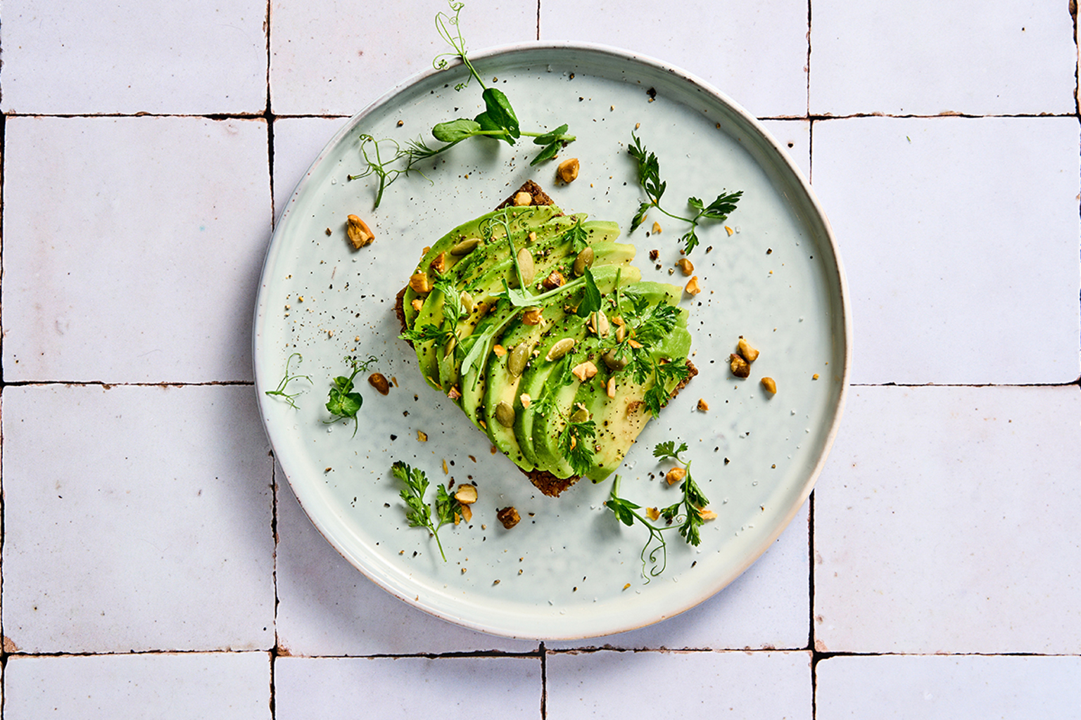 Avocado toast met groene kruiden en noten