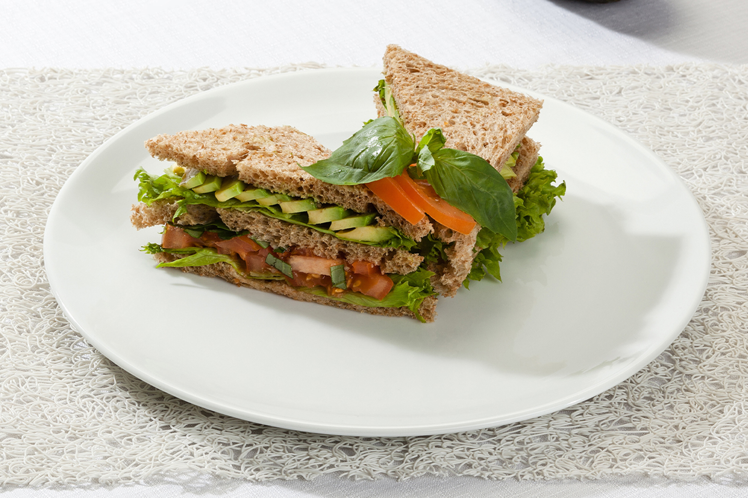 Snijd de korsten van het brood. Beleg een sneetje brood met 2 blaadjes sla, tomaat en bestrooi met basilicum. Leg er een tweede sneetje brood op. Beleg dit met sla en avocado. Bestrooi naar smaak met peper en zout en bedek met brood. Maak zo nog een sandwich. Snijd ze schuin doormidden.
