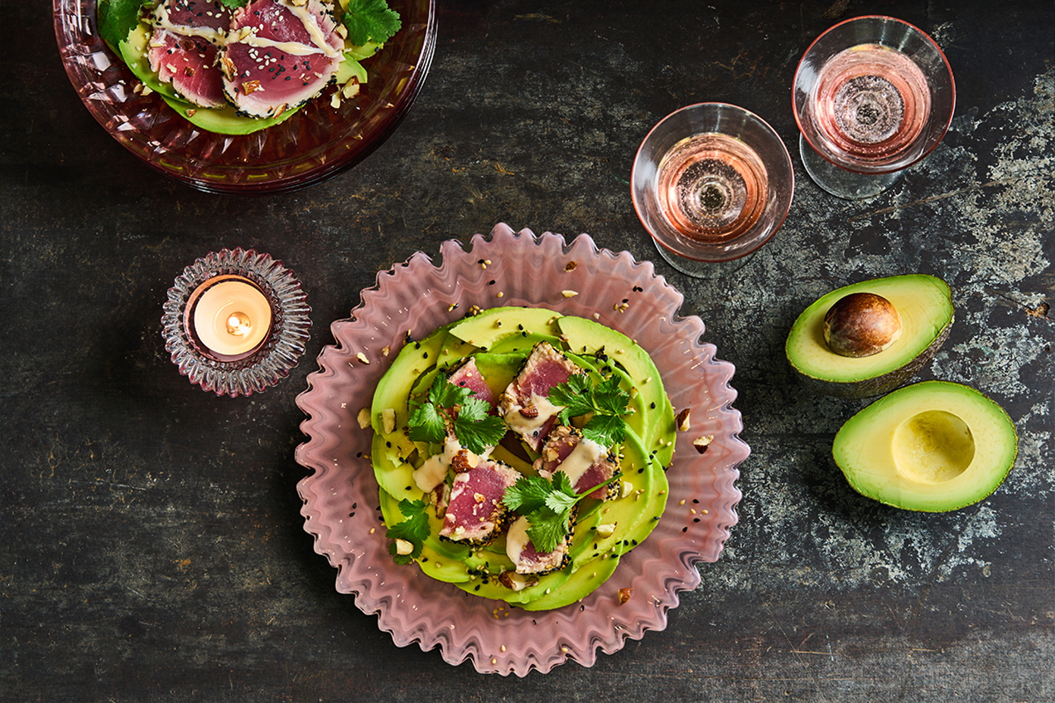 Probeer de avocado zo dun mogelijk te snijden voor een goeie carpaccio-vibe, maar cruciaal is het niet. Vooral de tonijn is dungesneden het lekkerst dus zorg voor een vlijmscherp mes.
