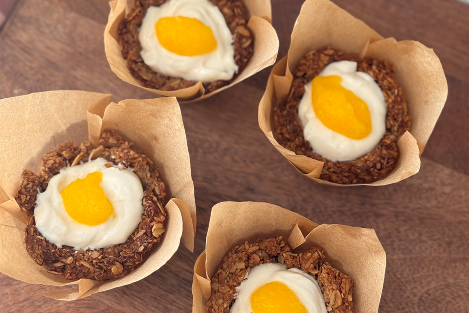 Verdeel eerst de yoghurt over de taartjes en maak af met een toef mangopuree op ieder taartje.