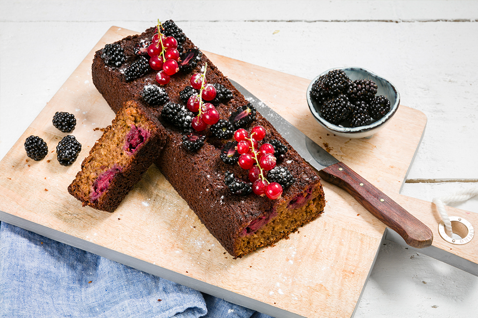 Bak het bananenbrood in ca. 50 min. goudbruin en gaar. Check met een satéprikker, komt deze er schoon en droog uit dan is de cake gaar. Laat afkoelen op een rooster. Garneer met extra bramen of andere bessen.