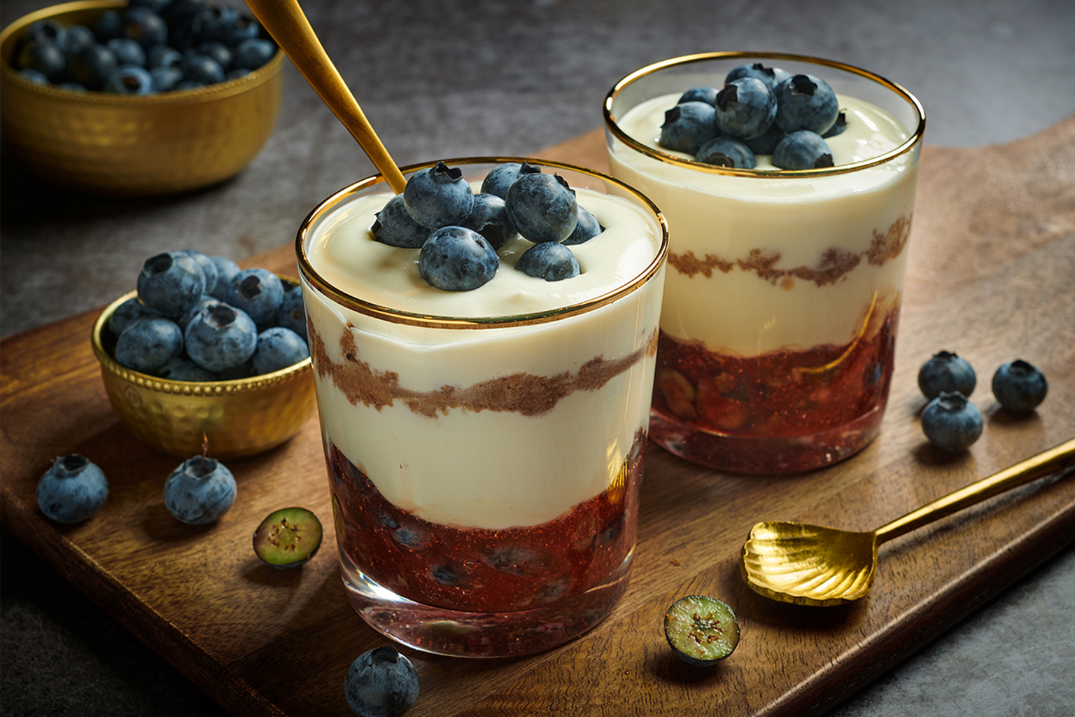 - Verdeel de blauwe bessenpuree over 4 glazen, schep de helft van het yoghurtroommengsel erop, dan de koekkruimels en de rest van het yoghurtroommengsel. Garneer met de rest van de blauwe bessen.