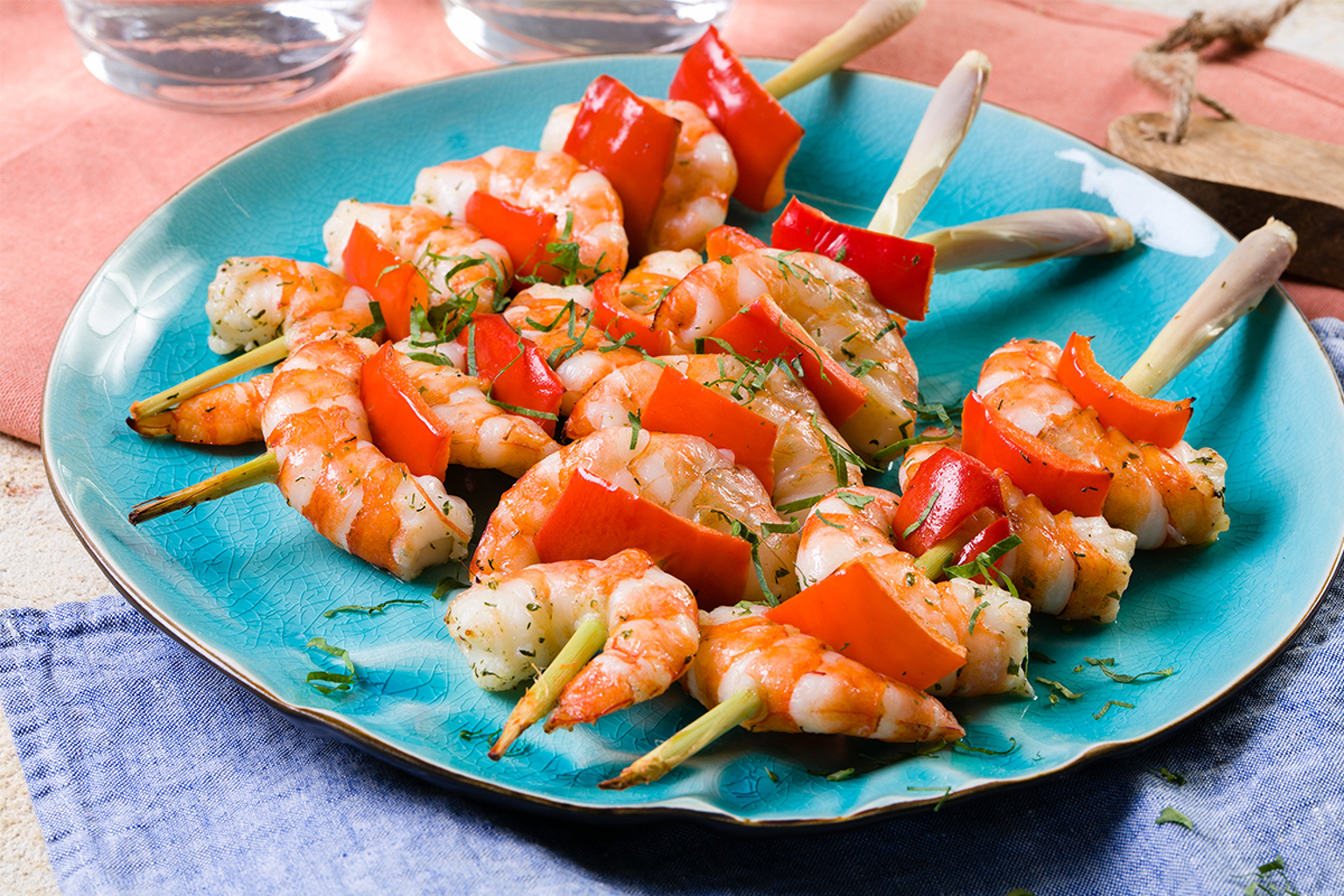 Rijg de paprika en garnalen voorzichtig om en om aan de citroengrasstengels.