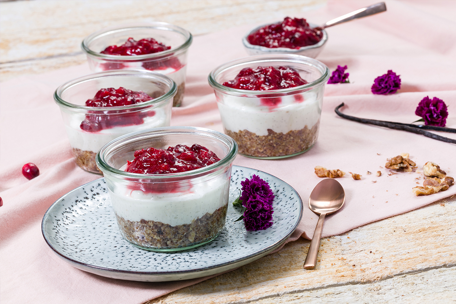 Snijd de dadels en de walnoten fijn. Smelt de kokosolie in een steelpan, neem eenmaal gesmolten van het vuur en voeg de dadels, walnoten, amandelmeel en kokosbloesemsuiker toe. Verdeel dit over vier glazen en druk aan met een lepel.