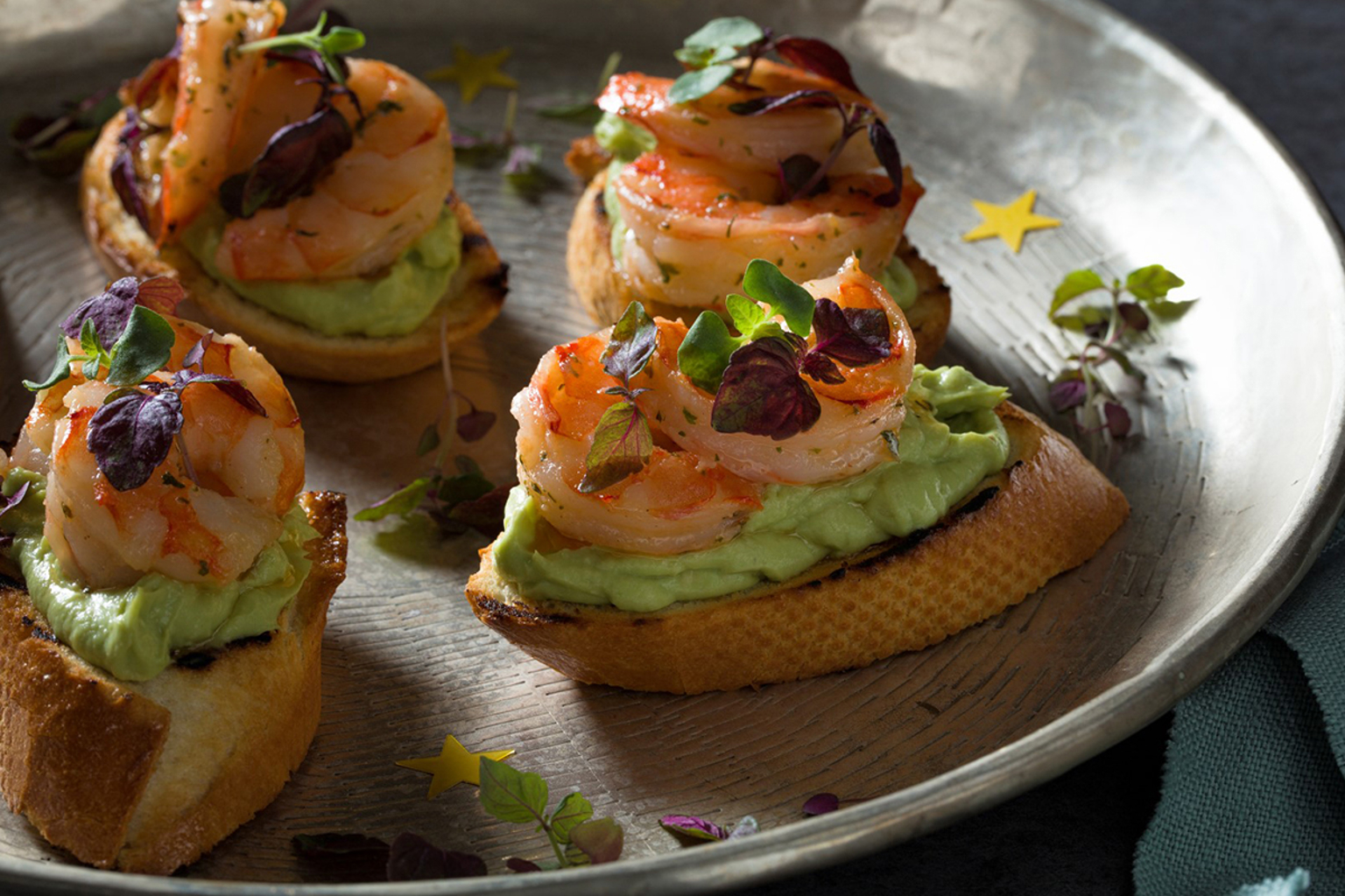 Bestrijk de stokbroodjes met avocadopuree en beleg met de gamba’s.