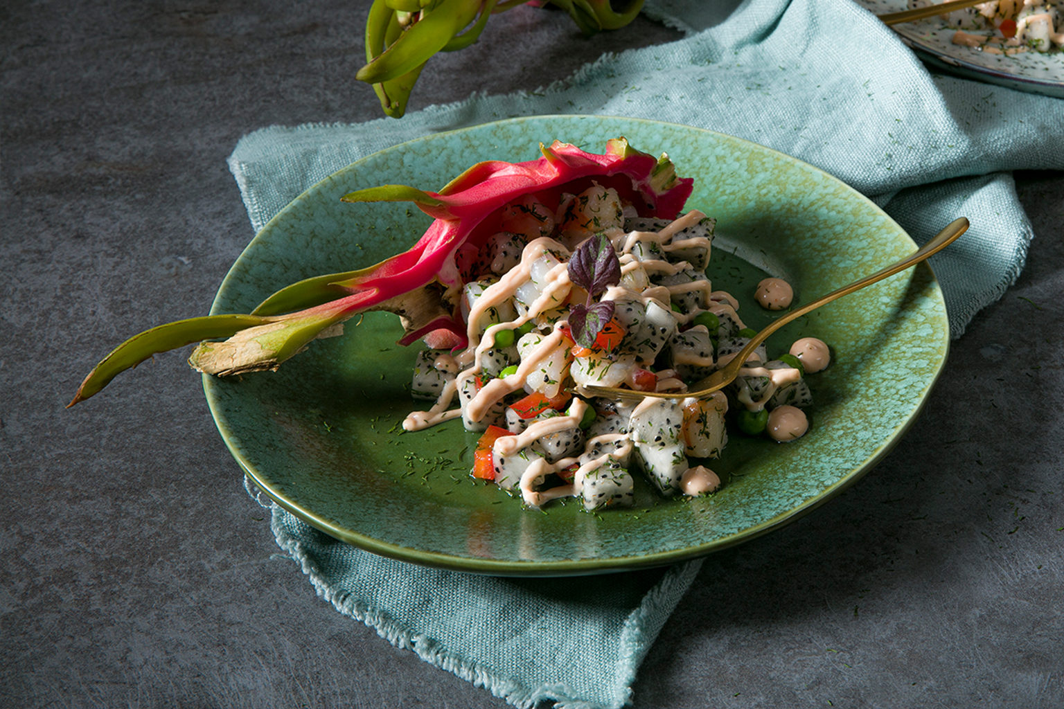 Kook de doperwten ca. 2 min. in kokend water. Giet ze af. Halveer de drakenvruchten in de lengte en schep met een lepel het vruchtvlees uit de vrucht. Bewaar de schillen. Snijd het vruchtvlees in blokjes. Snijd de paprika en gamba’s in gelijke blokjes en meng ze met de drakenfruitblokjes in een mengkom. Snijd de dille fijn en voeg toe. Voeg de doperwten toe en meng alles goed door elkaar.