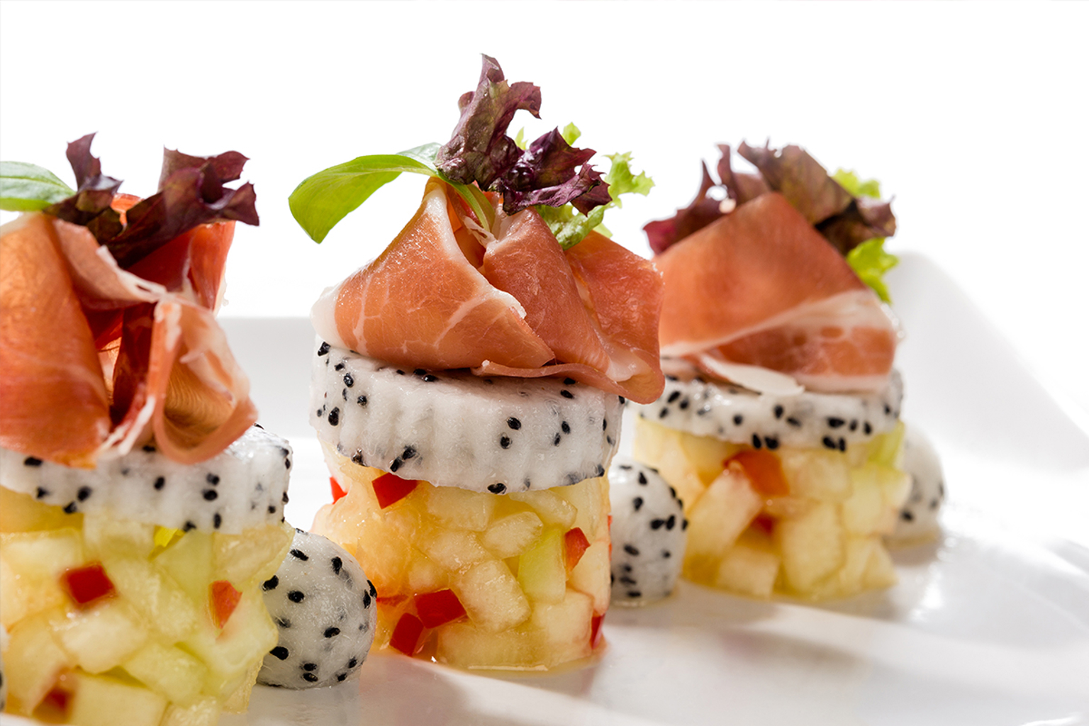 Maak drie torentjes per bord en leg de bolletjes drakenfruit ertussen.
