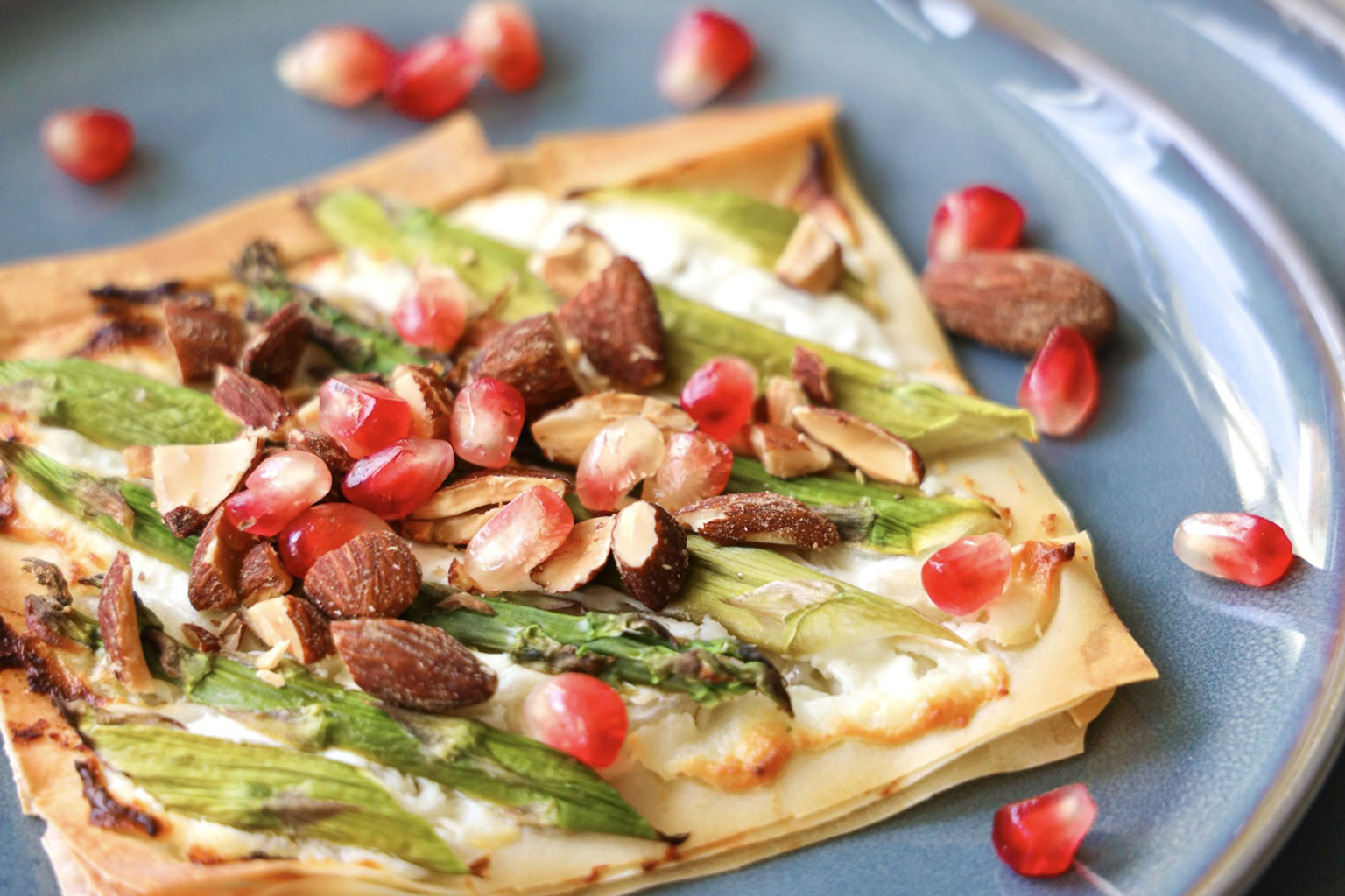 Zet de filodeegtaartjes 25-30 minuten in de oven, tot de randjes van het filodeeg mooi goudbruin zijn. Haal ondertussen de pitjes uit de granaatappel (pas op je kleding!) en hak de amandelen in kleinere stukjes.