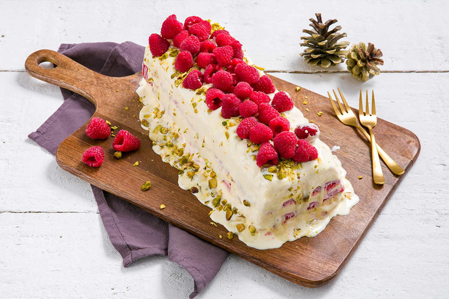 Neem de ijstaart uit de cakevorm, verwijder het plasticfolie en schenk de chocolade erover. Bestrooi met de pistachenoten en de rest van de frambozen.